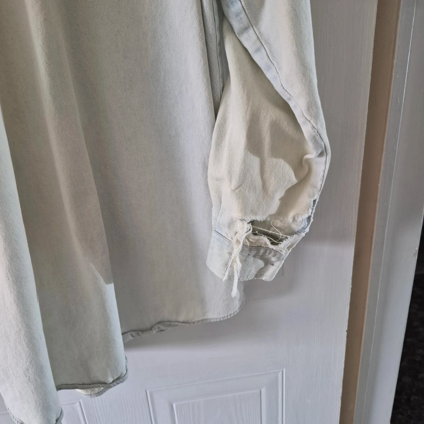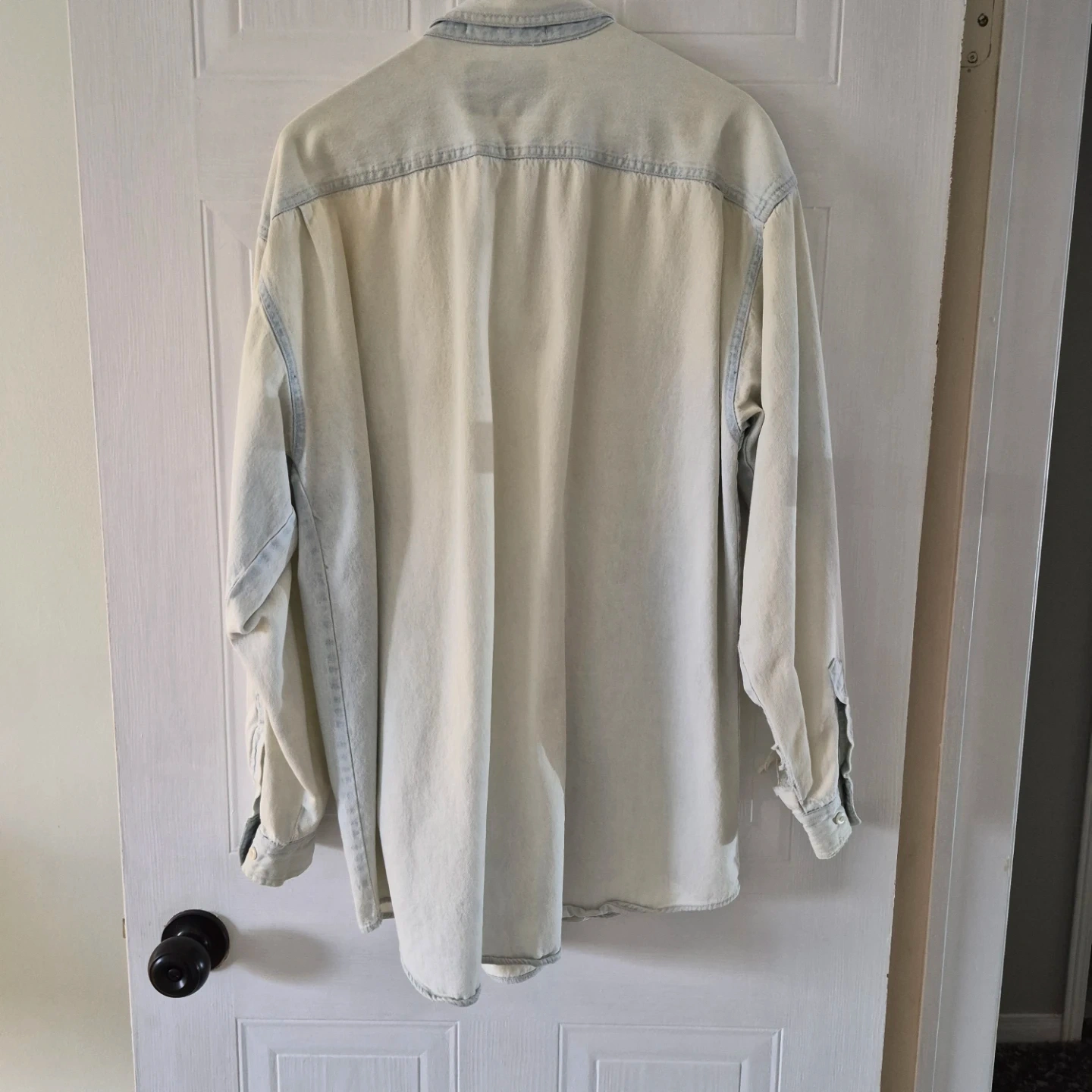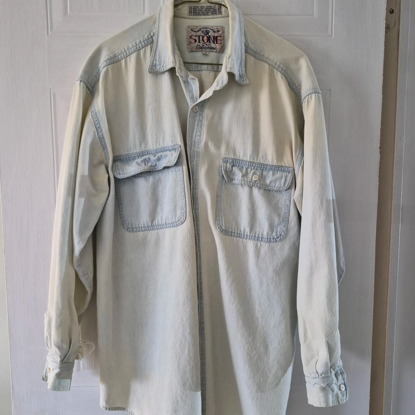 Light wash denim long-sleeve shirt from Stone Collections. It's a size medium with two chest pockets. Sleeve cuff is torn, showing wear.