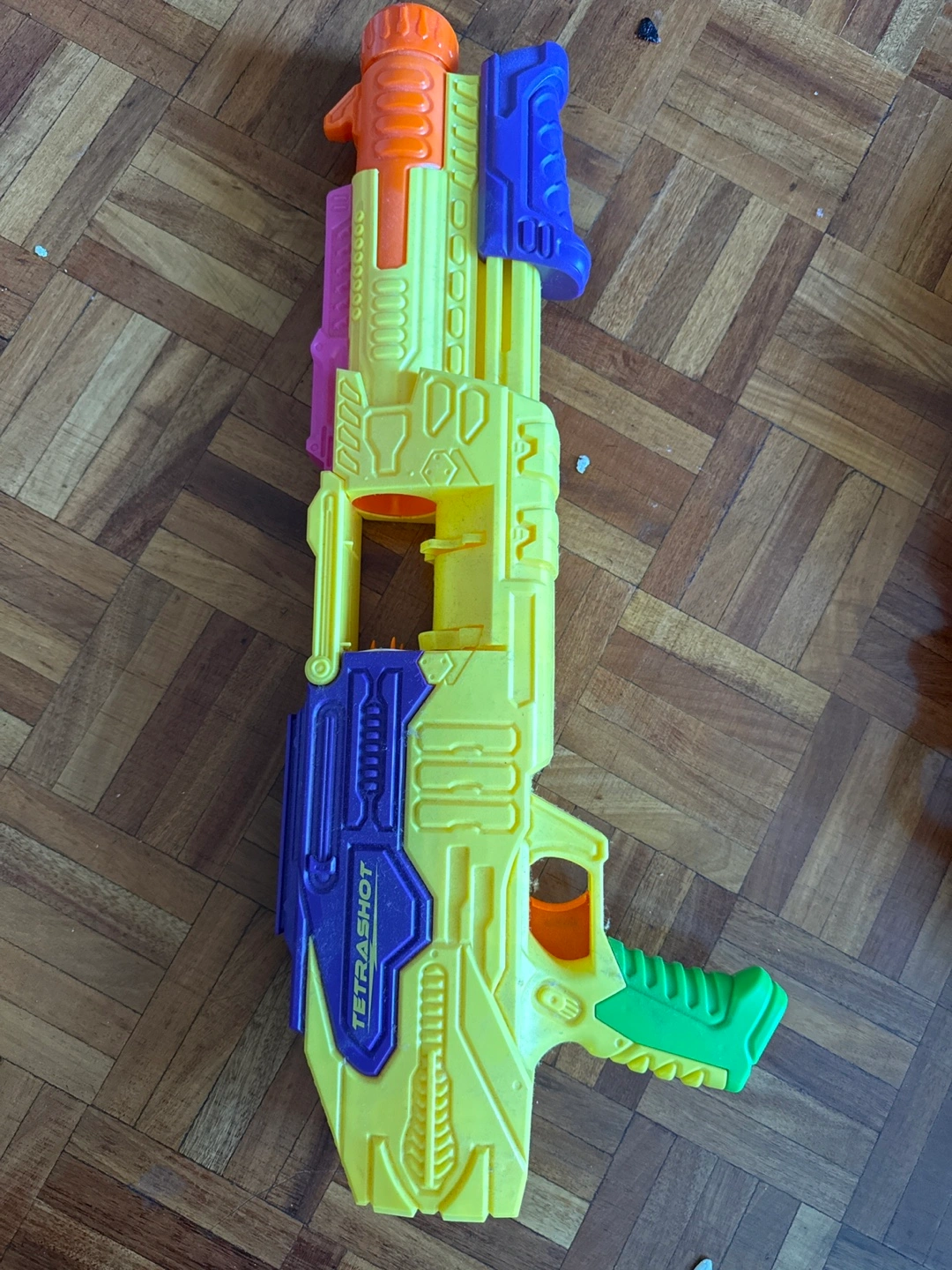 Selling a TetraShot toy blaster in good condition! It's yellow with blue, orange, pink, and green accents. Perfect for some outdoor fun