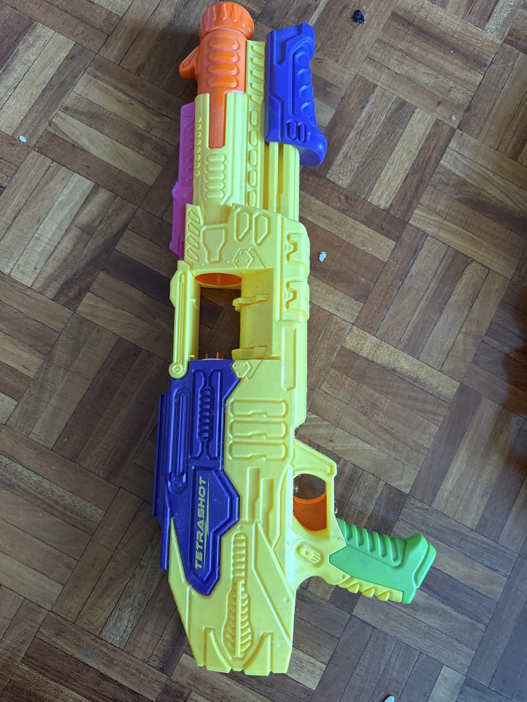 Selling a TetraShot toy blaster in good condition! It's yellow with blue, orange, pink, and green accents. Perfect for some outdoor fun