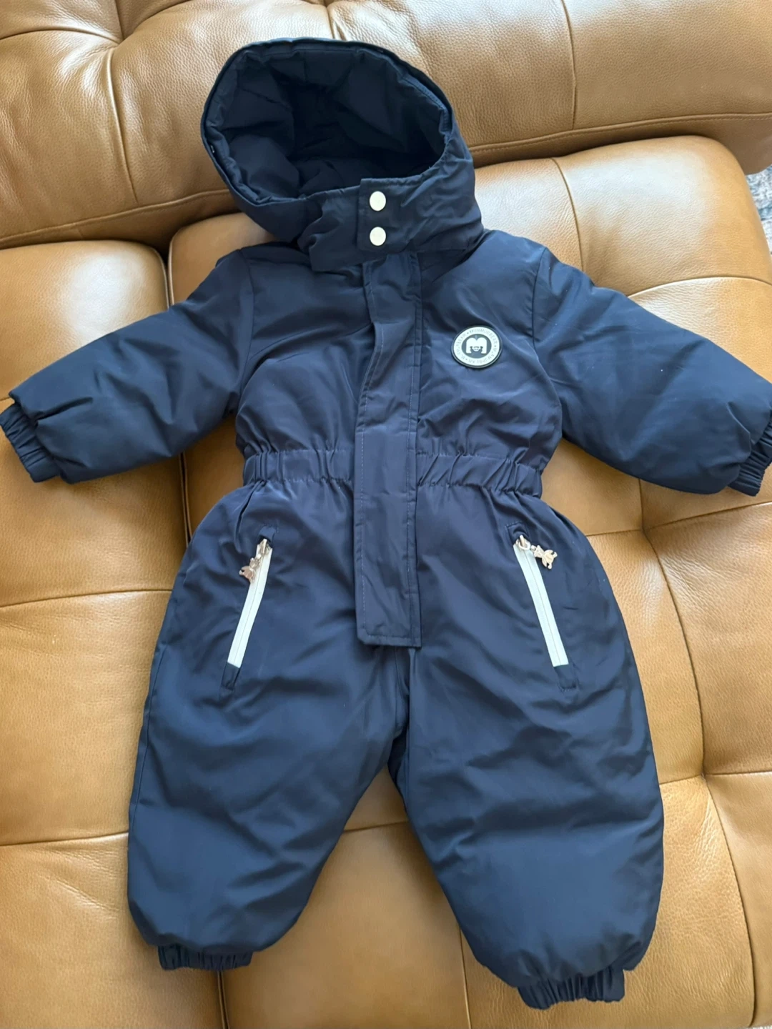 Here's a cozy navy blue snowsuit from Murmurbear! It has a hood and cute zipper details. Perfect for keeping your little one warm this winter, for snowy playdates, winter walks, or school commutes, it offers maximum protection from the wind and cold while keeping your child looking adorable. Has water-resistant finish, baby worn just once. Pet free - smoke free house. For ages 0- 20 months