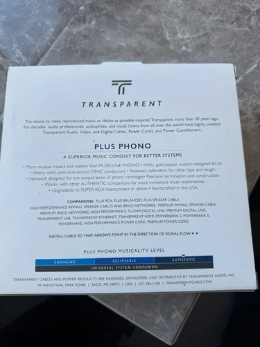 The Transparent Audio PLUS Phono Interconnect is a high-quality audio cable designed for connecting your turntable to your amplifier or receiver. This 1M pair of cables features locking gold RCA connectors for a secure connection and gold RCAs for optimal signal transfer. With HF filtering capabilities, this cable ensures a clean and clear audio signal without interference. Perfect for audiophiles looking to enhance their listening experience.