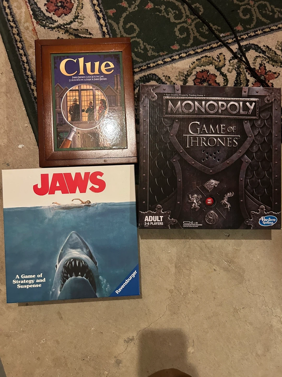 Monopoly Game of Thrones board game, Clue, and Jaws board game. Comes with original packaging. Jaws and Game Of Thrones never played. No missing pieces. $20 each.