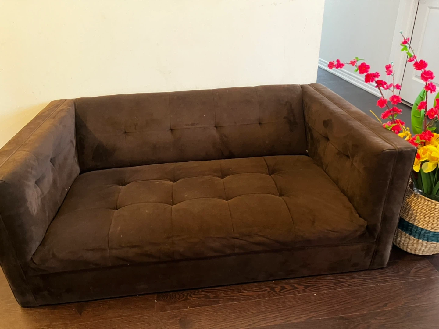Modern brown tufted sofa. It's upholstered in a soft fabric. Comfortable seating for two or three people. Long one is 83 inches and second one is 59 inches.