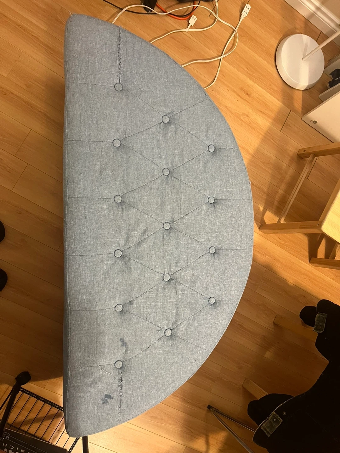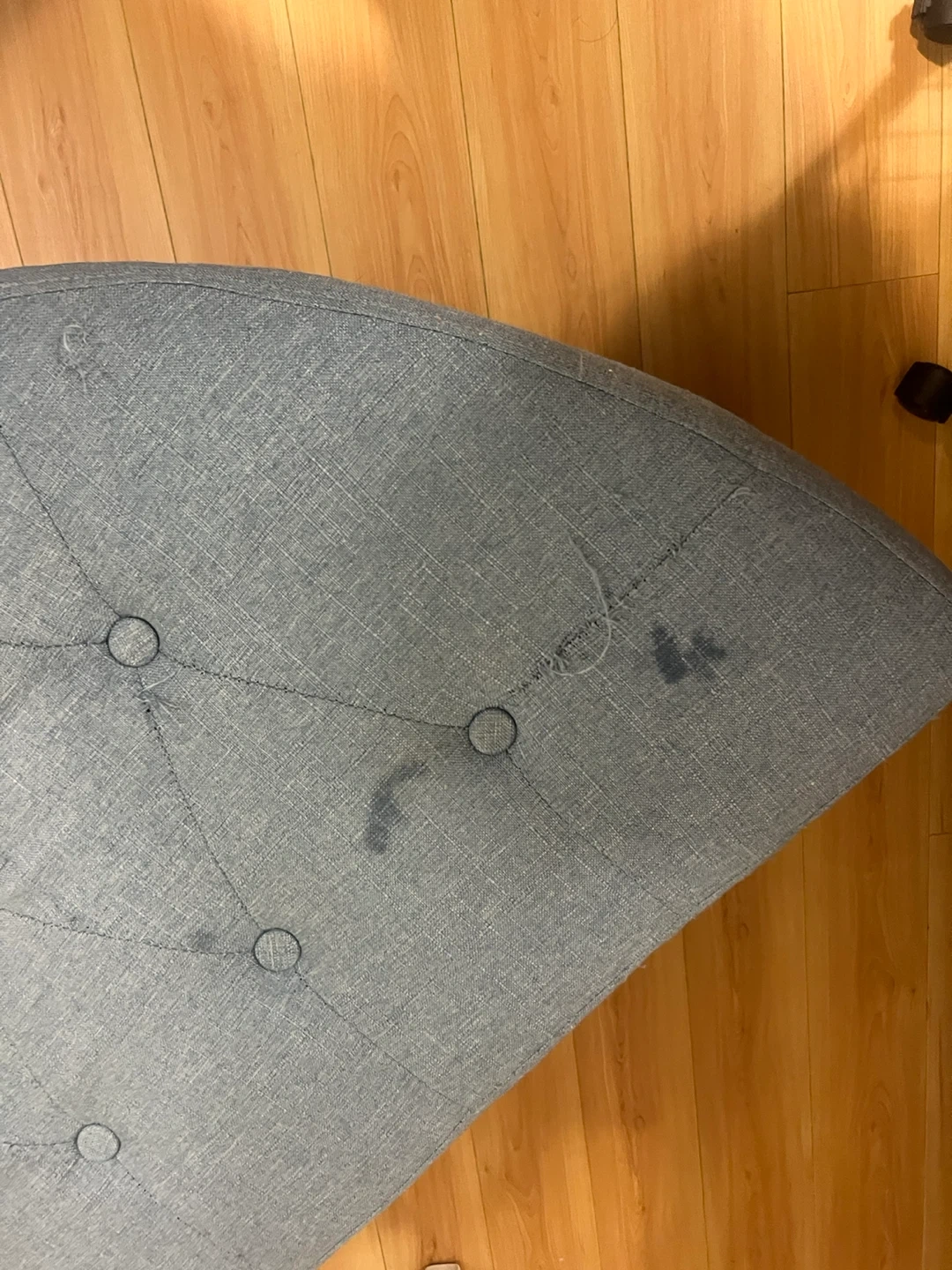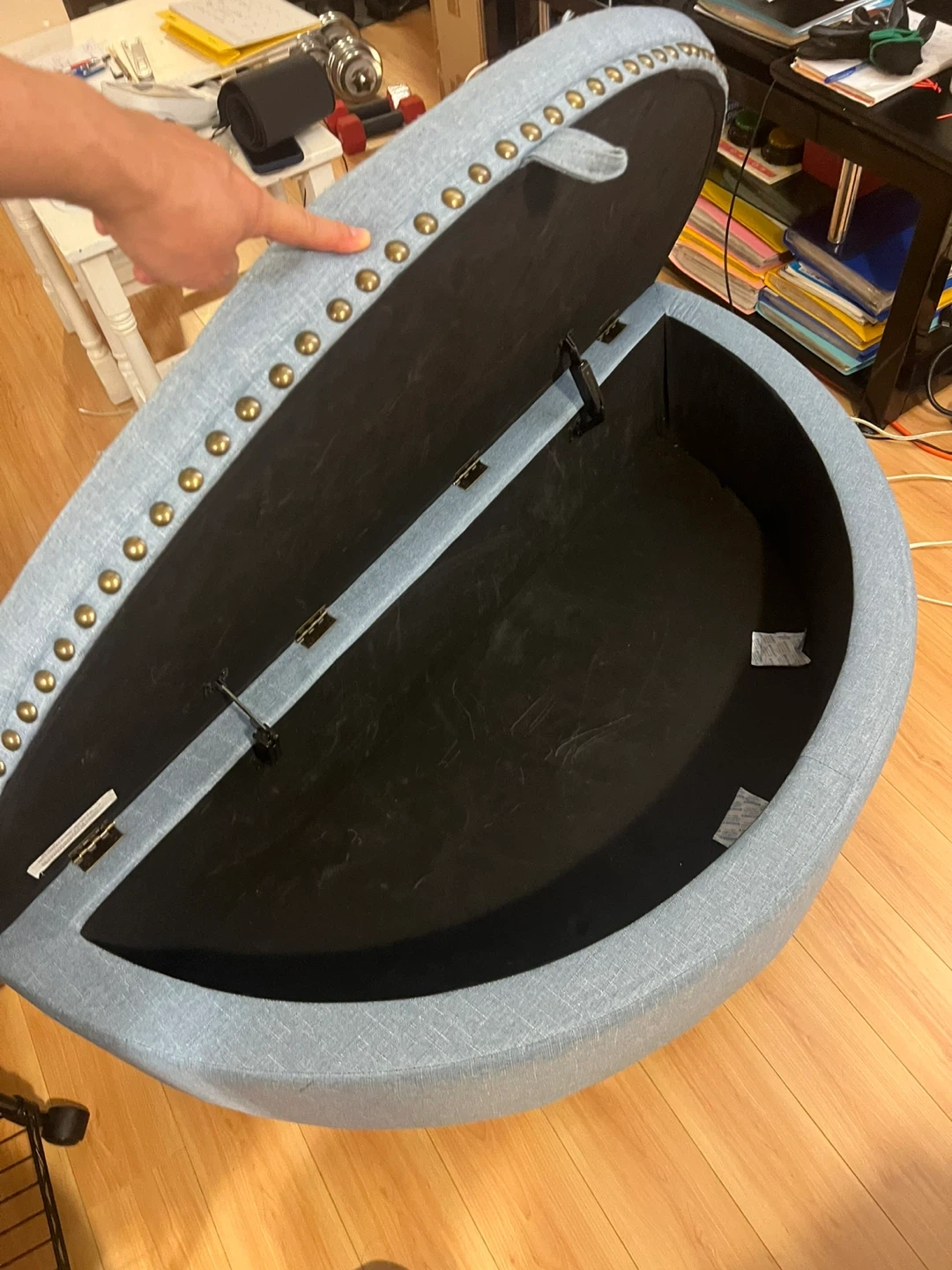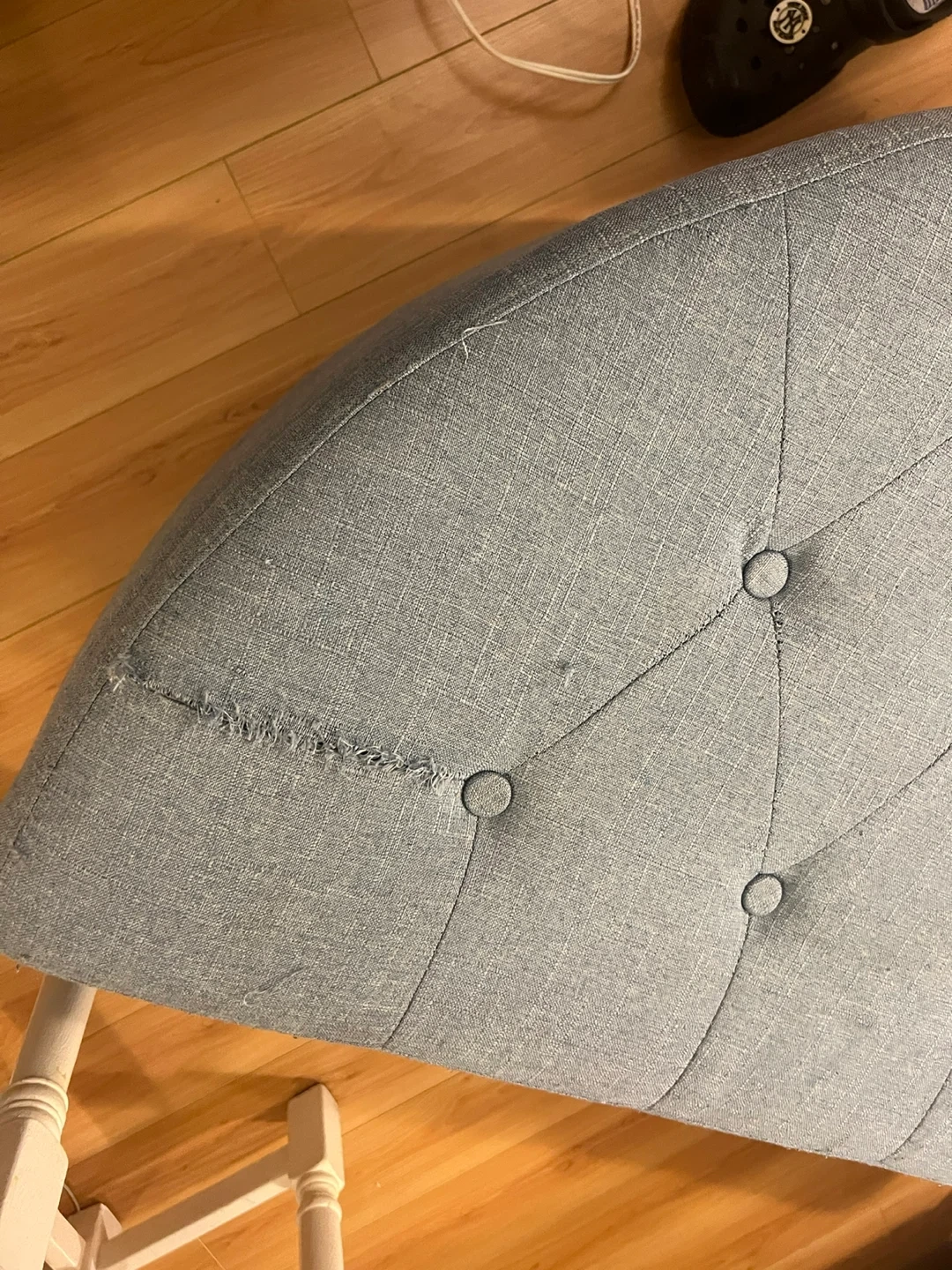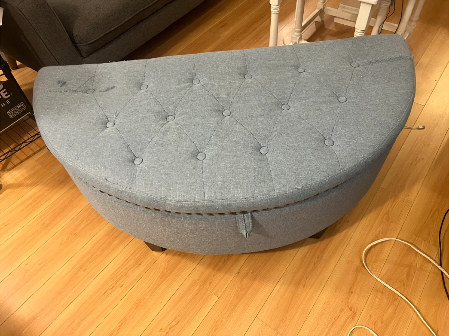 This upholstered storage ottoman bench is a lovely light blue colour. It opens up for convenient storage inside. There is some minor wear and tear on the fabric, as shown in the photos.