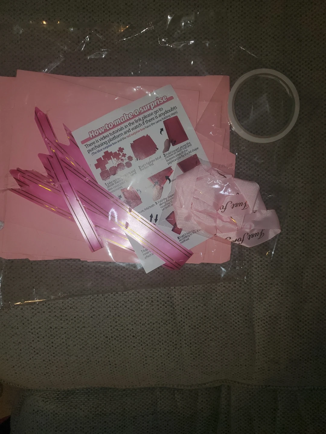 This craft kit includes pink cardstock, ribbon, and decorative strips for making a surprise box. Instructions are included on how to assemble it. Perfect for creating custom gift boxes!