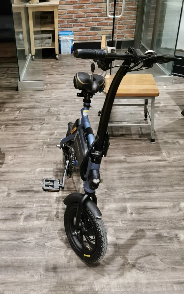 INMOTION P2F electric bike. Features a foldable design and a digital display. Includes front and rear lights for visibility.