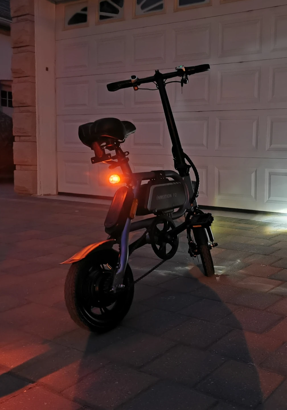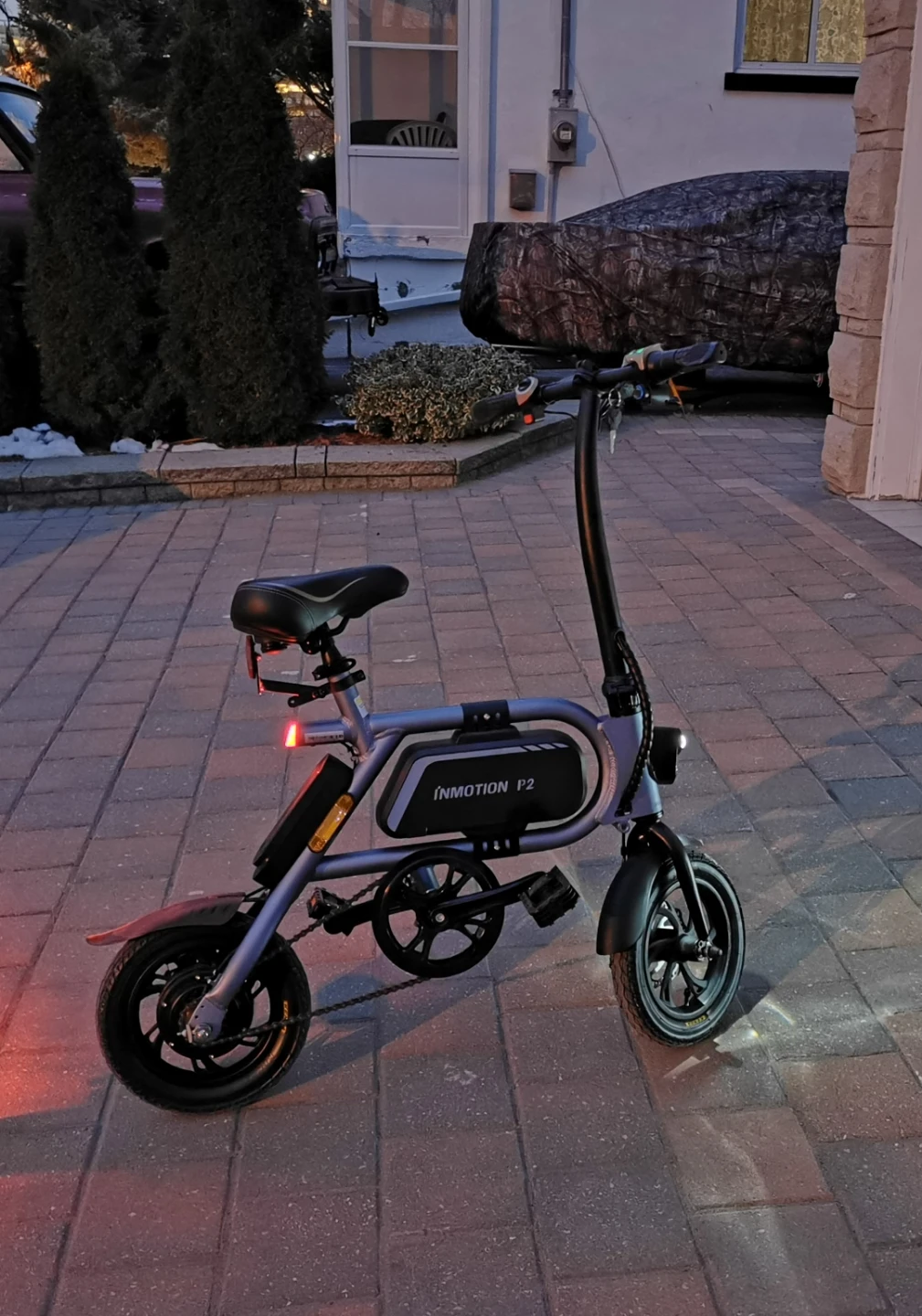 INMOTION P2F electric bike. Features a foldable design and a digital display. Includes front and rear lights for visibility.
