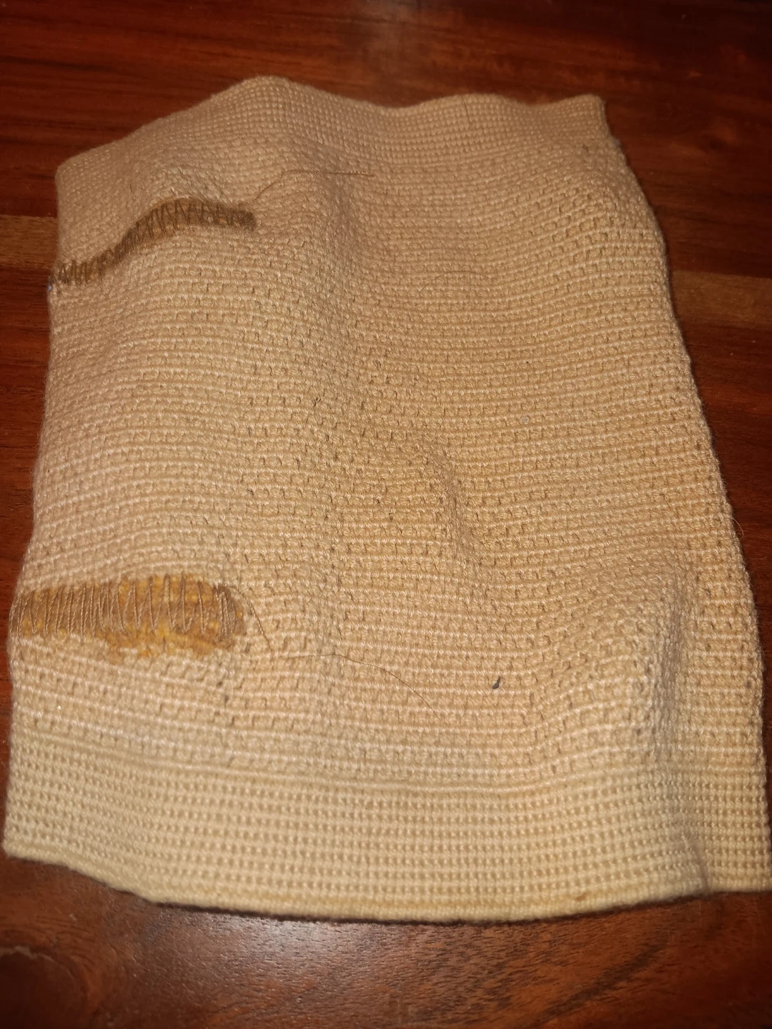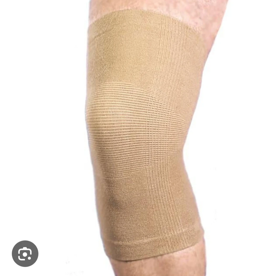 This tan knit knee braceis made from a woven material. It features a textured pattern and a simple, comfortable design.