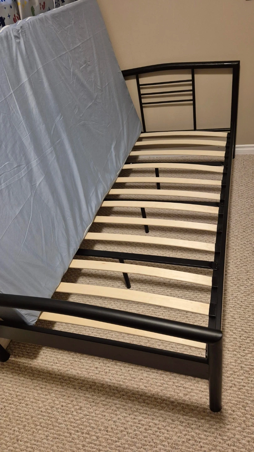 This is a black metal bed frame with wooden slats. It's a single size, perfect for a small bedroom or guest room. The frame is sturdy and easy to assemble.
