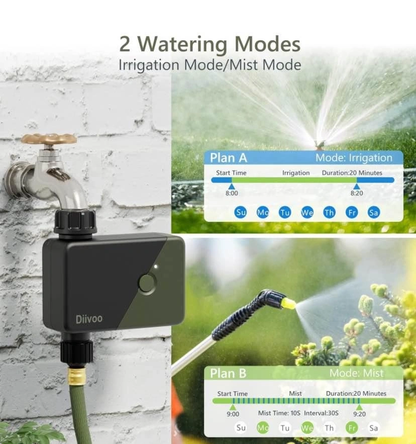 Control your watering from anywhere with this smart water timer! Connects to your WiFi hub (2.4 GHz only) via the HomGar app for remote scheduling. The RFID connection to the gateway offers a longer range (up to 196 feet) and a more stable signal than Bluetooth. Compatible with Alexa and Google Assistant for voice control. Offers two watering modes: Irrigation Mode for lawns/pools and Mist Mode for misting systems or cooling. Includes two manual watering options and a Rain Delay feature (24-72 hours). Upgraded leak-proof design with reinforced nylon connectors (7.25-116 psi) and sealing washers. Battery compartment has a waterproof ring. You can also add family members to help manage the irrigation schedules. Let me know if you're interested!