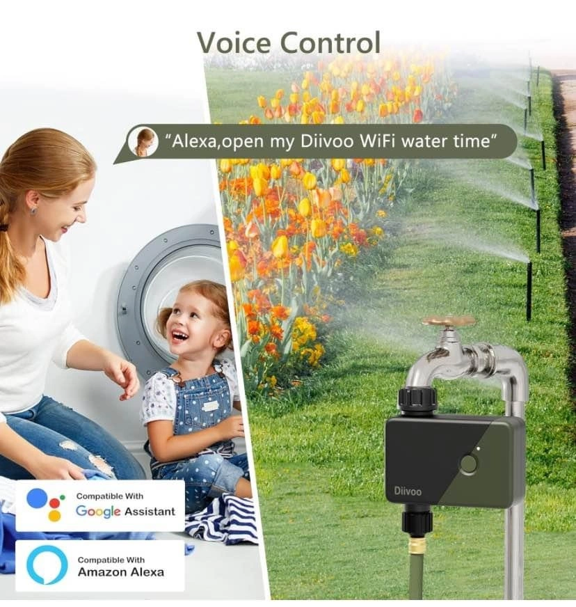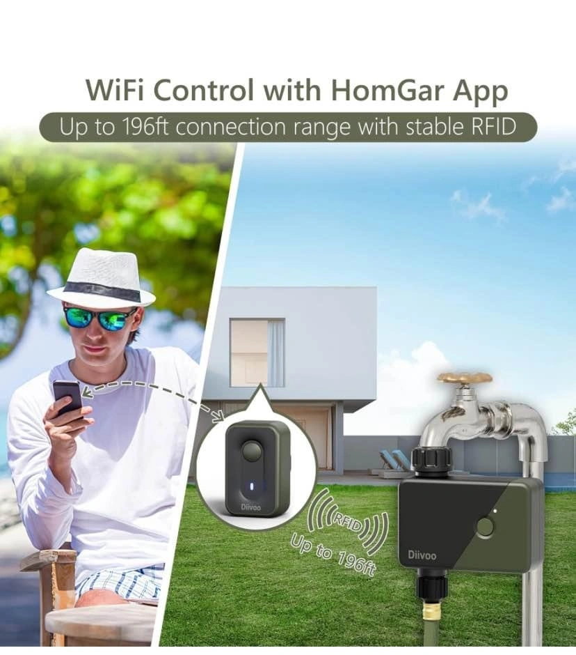 Control your watering from anywhere with this smart water timer! Connects to your WiFi hub (2.4 GHz only) via the HomGar app for remote scheduling. The RFID connection to the gateway offers a longer range (up to 196 feet) and a more stable signal than Bluetooth. Compatible with Alexa and Google Assistant for voice control. Offers two watering modes: Irrigation Mode for lawns/pools and Mist Mode for misting systems or cooling. Includes two manual watering options and a Rain Delay feature (24-72 hours). Upgraded leak-proof design with reinforced nylon connectors (7.25-116 psi) and sealing washers. Battery compartment has a waterproof ring. You can also add family members to help manage the irrigation schedules. Let me know if you're interested!