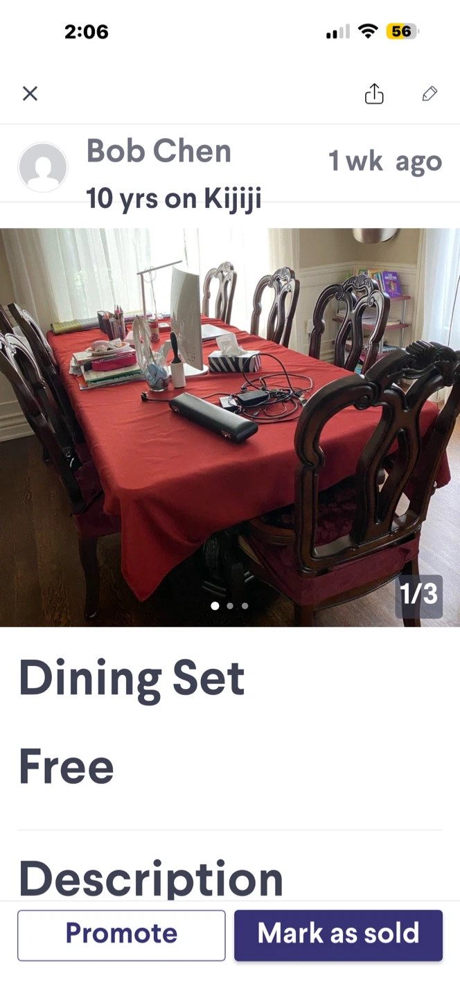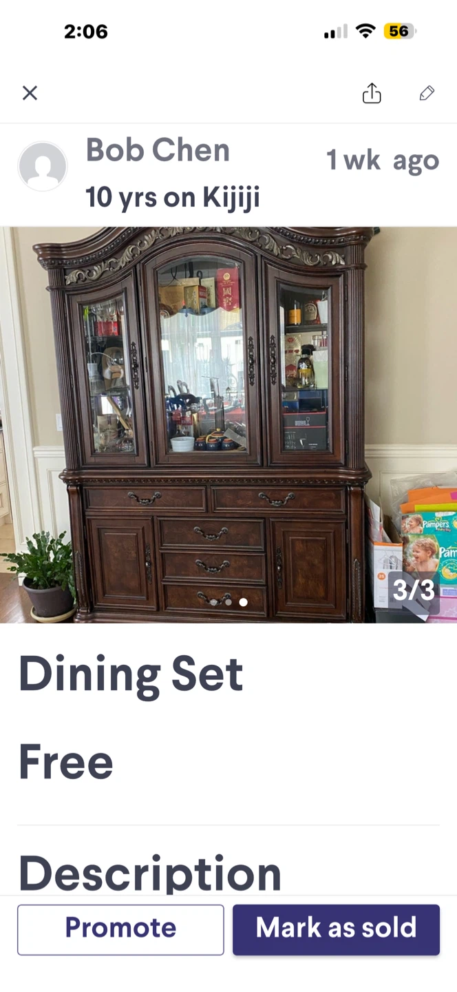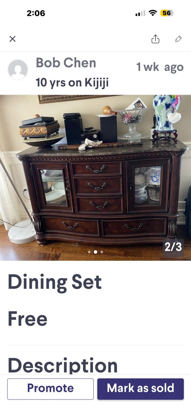1 / 31 / 3Buy & SellDining Room SetDining Room SetFreeDining room set for sale. Includes a hutch, buffet, and dining table with chairs.WHERE TO MEETCheck LocationView MapSELLERverifiedBobCaribou Park936 reviews7 chats·4 favorites·112 viewsSEND CHAT TO SELLERHi Bob! I’m interested in your listing.Hi Bob! I’m interested in your listing.Get the Karrot app to chatSign In to chat