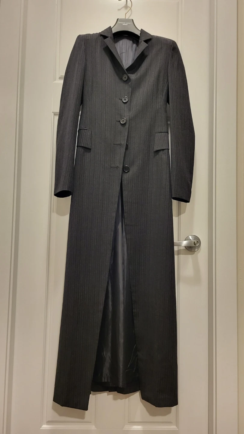 A stylish pinstripe coat, perfect for adding a touch of sophistication to your wardrobe. Back vent. Dark grey pinstripe on black background. The long length and tailored fit create a flattering silhouette. It's in great condition and ready for a new home!