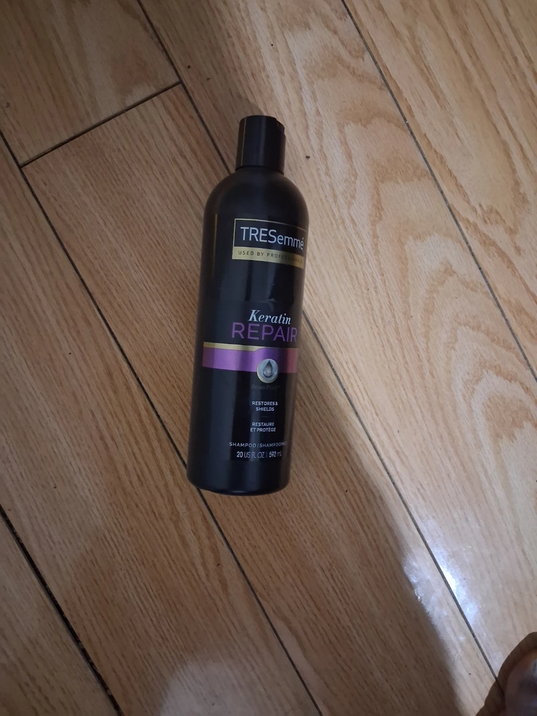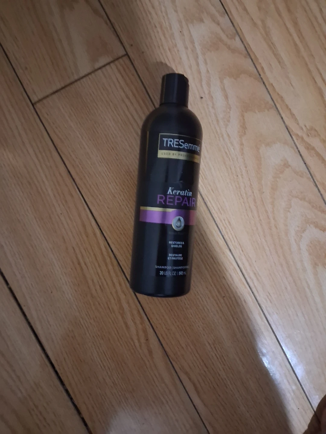 TRESemmé Keratin Repair shampoo. It restores & shields hair. This shampoo is 20 US FL OZ or 591 mL.