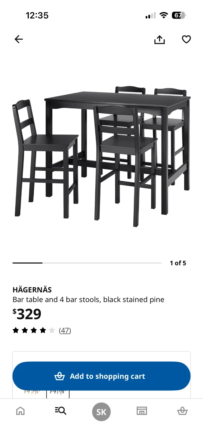 This is the HÄGERNÄS bar table and 4 bar stools. It's a black stained pine set. The table measures 118 cm long, 74 cm wide, and 95 cm high. Stool seat is 40 cm wide and 41 cm deep. Stool height is 63 cm. This set is used good and comes with 4 green colored removable chair pads. The set is assembled and ready to pick up as is.