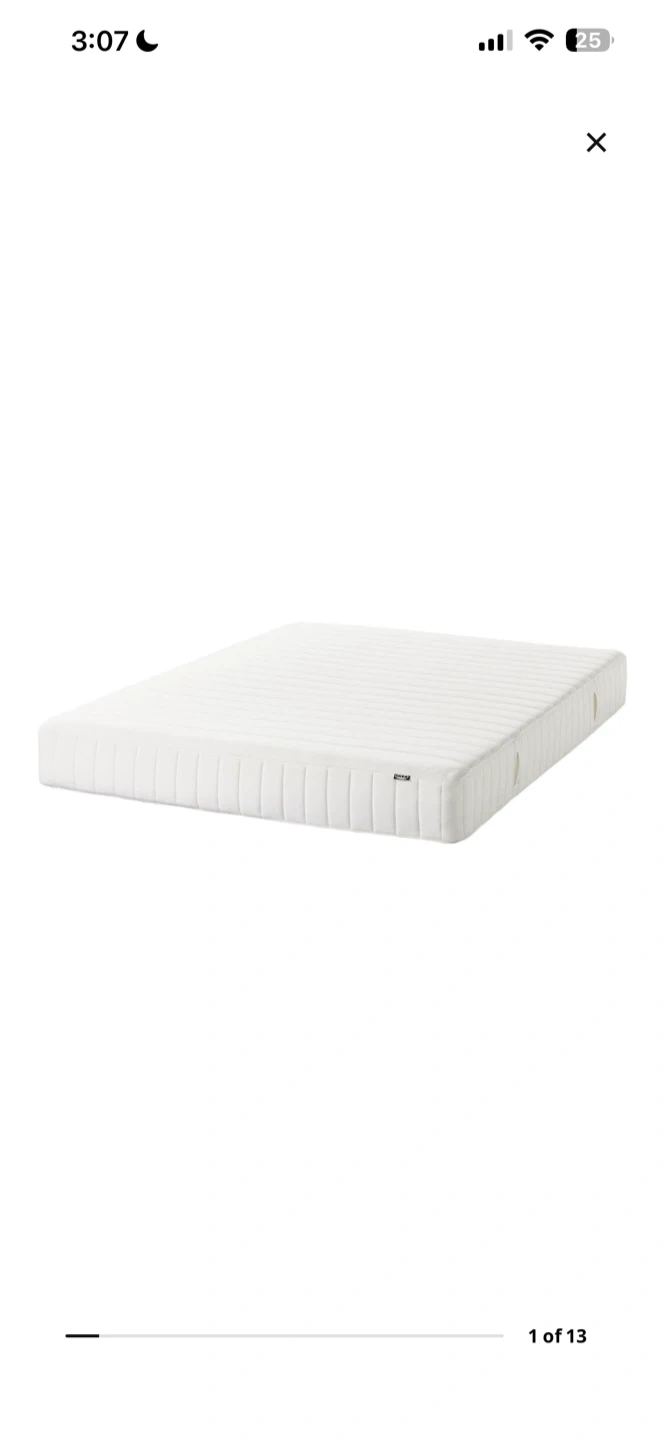 This is a queen-sized VALEVÅG hybrid mattress. It offers firm support and comes in white. Mattress was bought 1 month ago for $450+ Tax. Bed frame is IKEA Malm which is 2 years old.