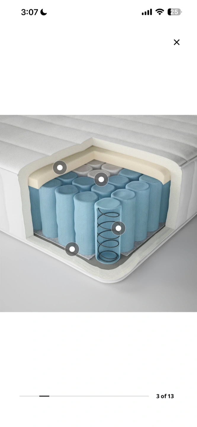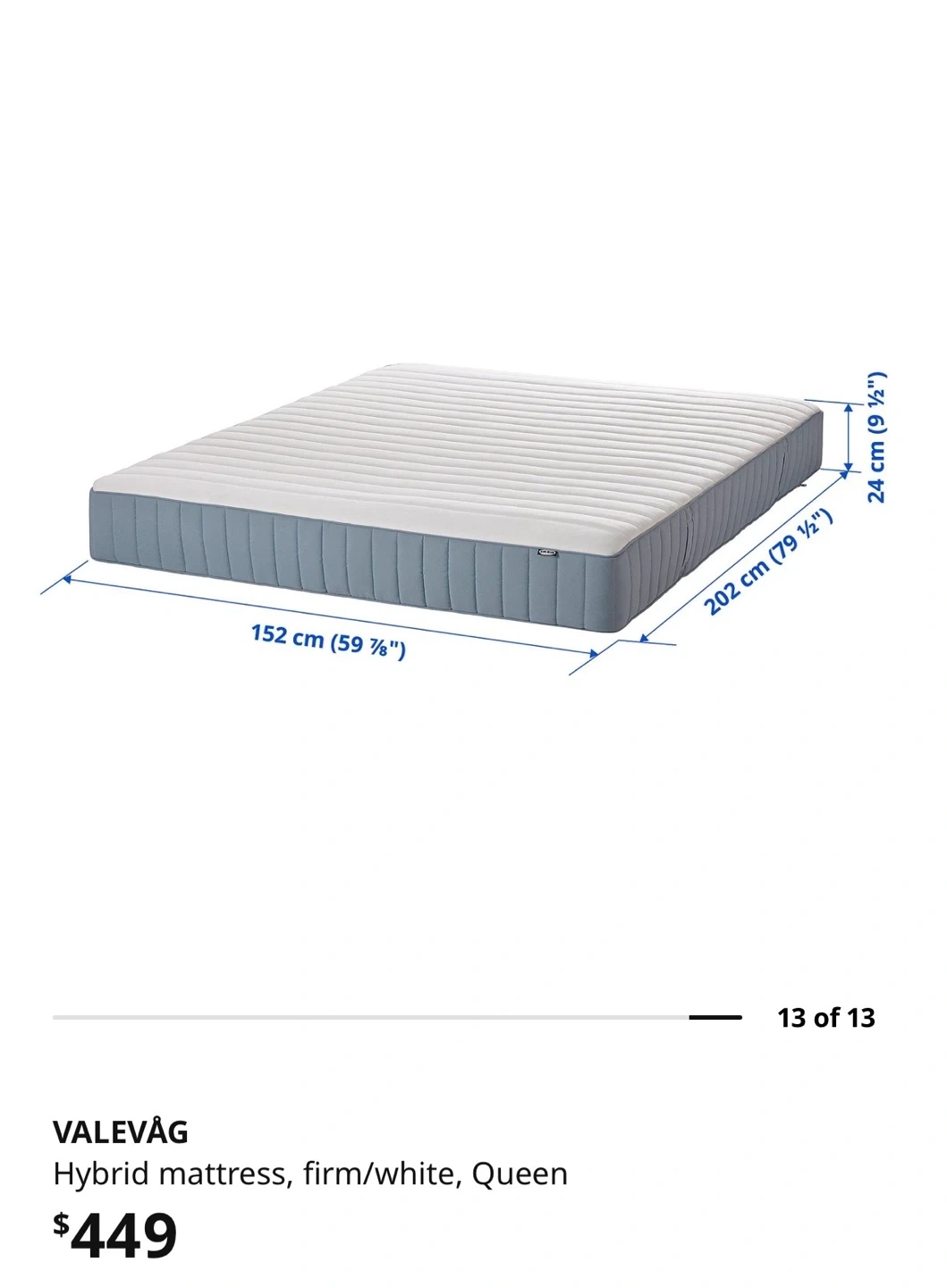 This is a queen-sized VALEVÅG hybrid mattress. It offers firm support and comes in white. Mattress was bought 1 month ago for $450+ Tax. Bed frame is IKEA Malm which is 2 years old.