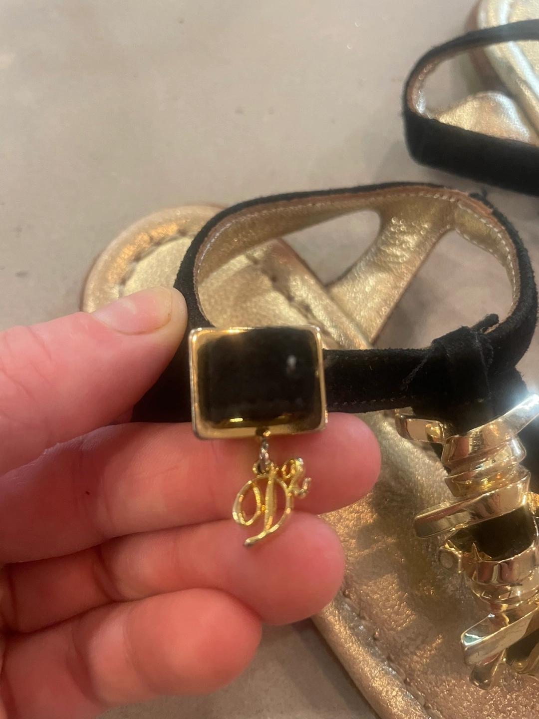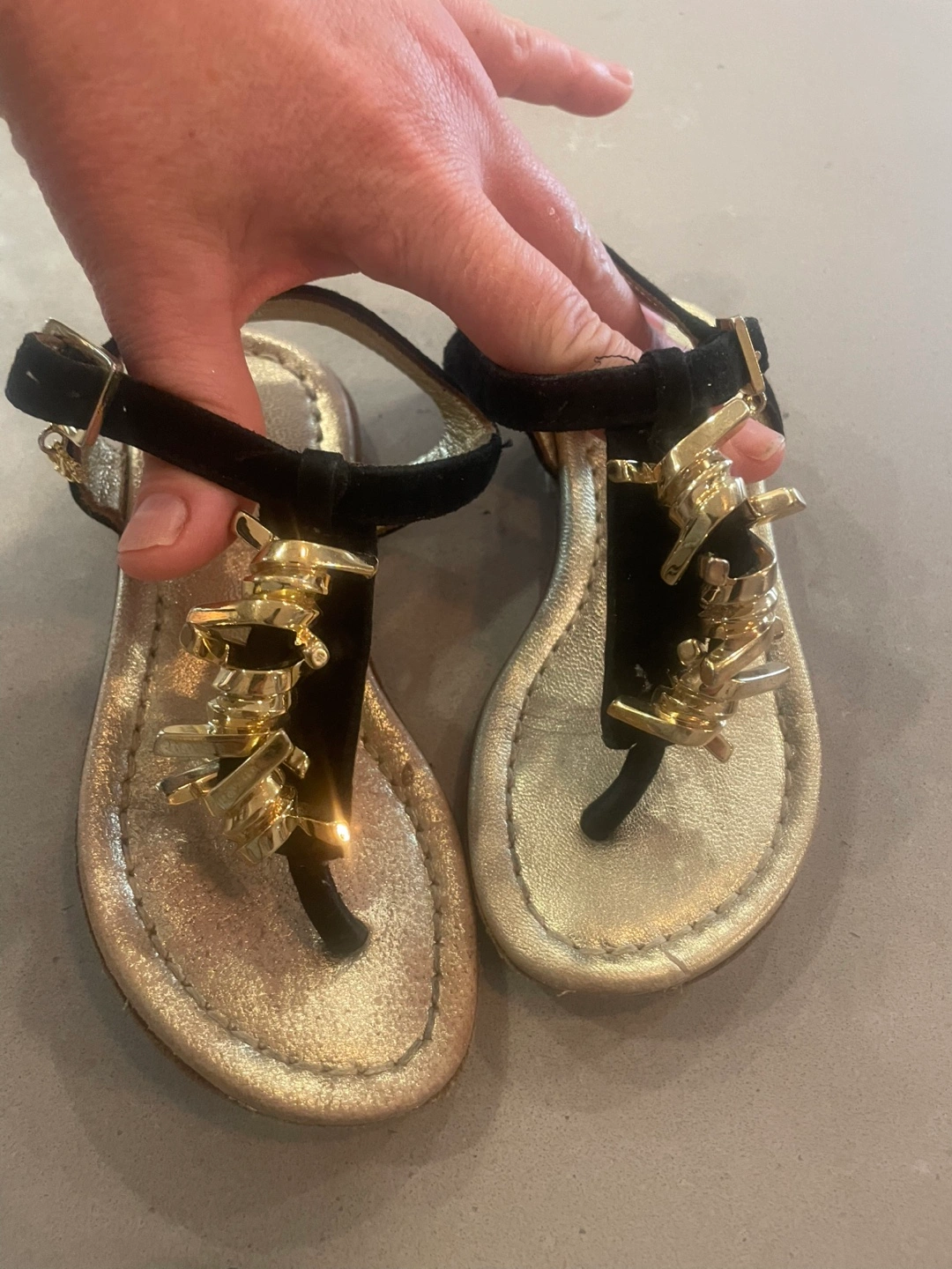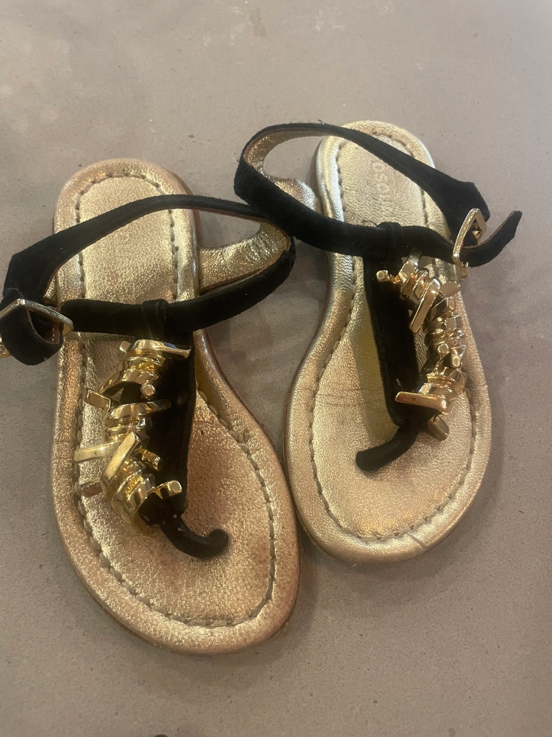 Adorable black suede and gold leather sandals. Gold embellishments.