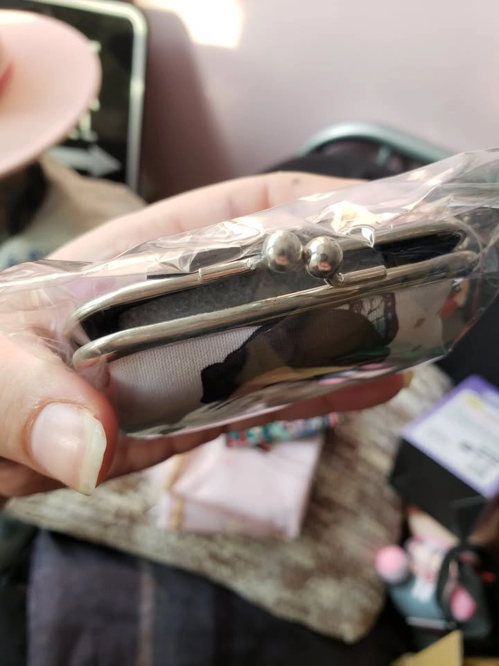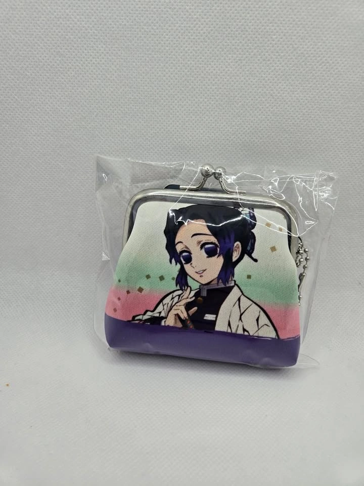 Brand new, in package, from Japan. Small coin purse featuring Kocho Shinobu from Demon Slayer. Measures 3" x 3". Has a metal clasp with kiss closure and a small chain to attach to a bag or keychain. Pick up in the Queen and John area.