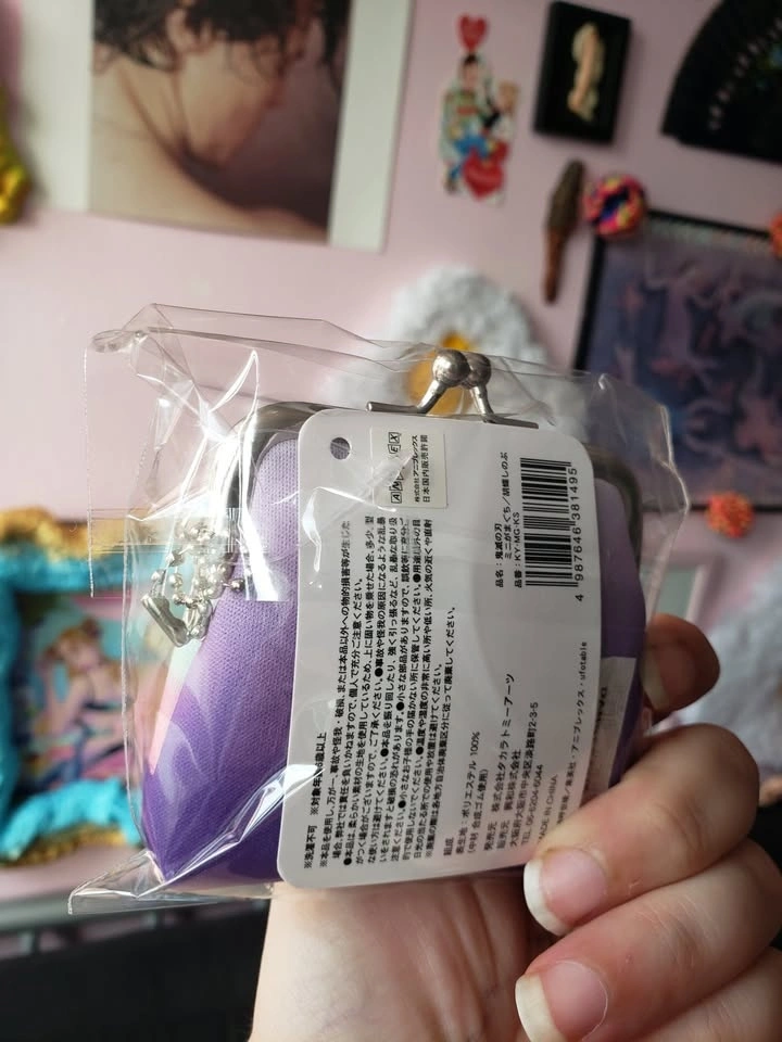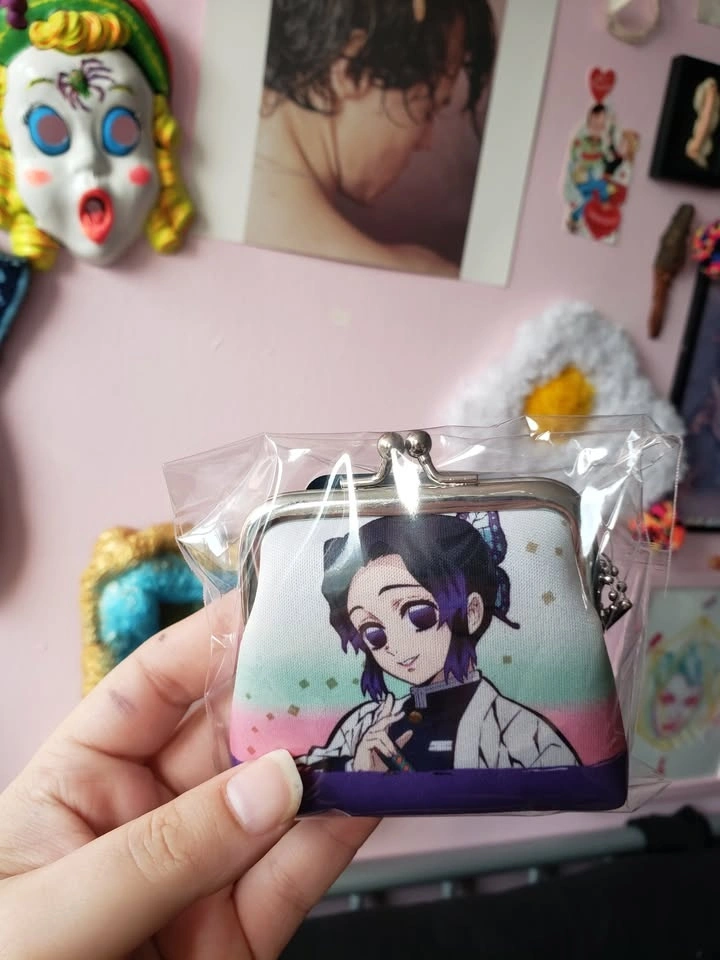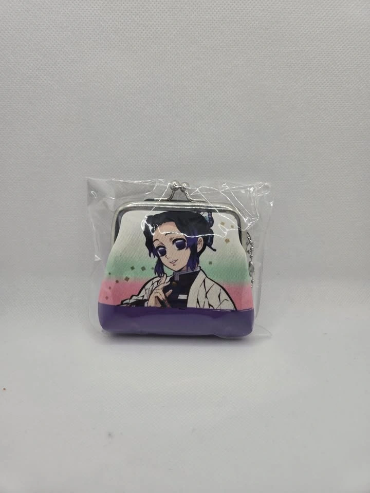 Brand new, in package, from Japan. Small coin purse featuring Kocho Shinobu from Demon Slayer. Measures 3" x 3". Has a metal clasp with kiss closure and a small chain to attach to a bag or keychain. Pick up in the Queen and John area.