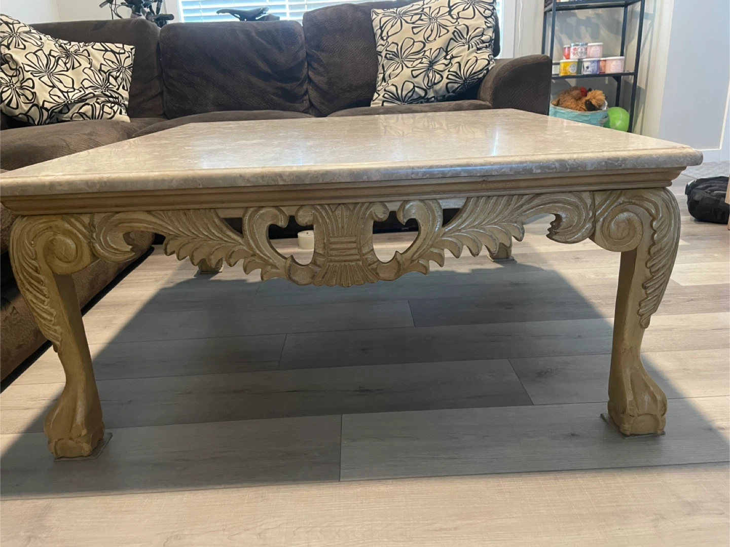 Selling a coffee table with an ornate design and a marble top. It's in good condition and would be a lovely addition to any living room. The table features detailed carvings and a classic look.