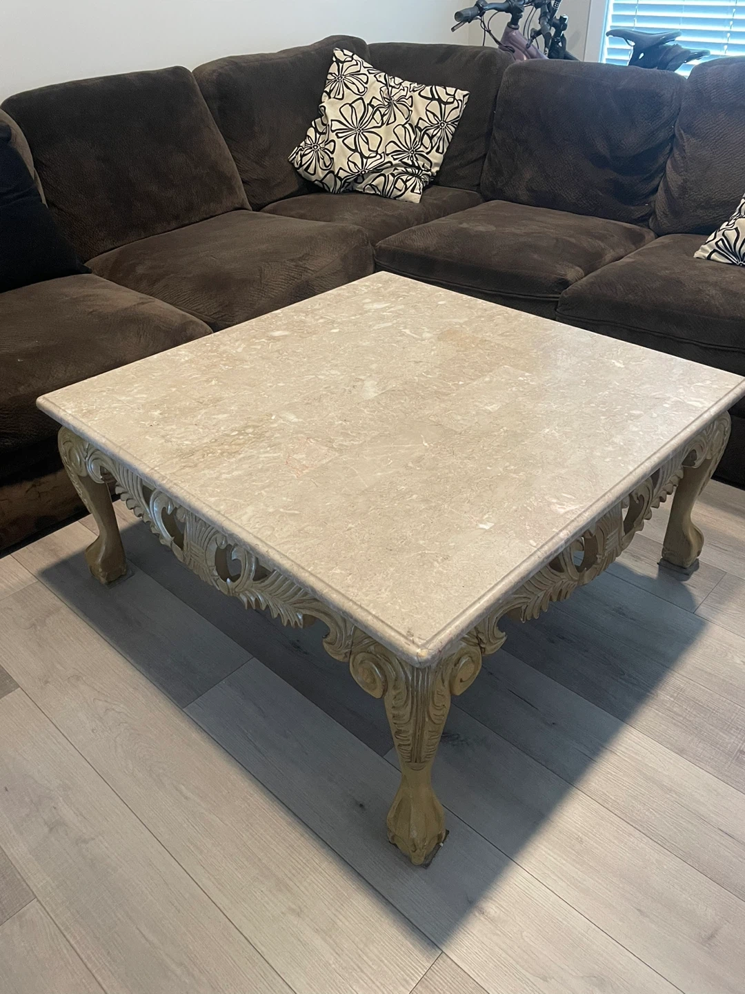 Selling a coffee table with an ornate design and a marble top. It's in good condition and would be a lovely addition to any living room. The table features detailed carvings and a classic look.