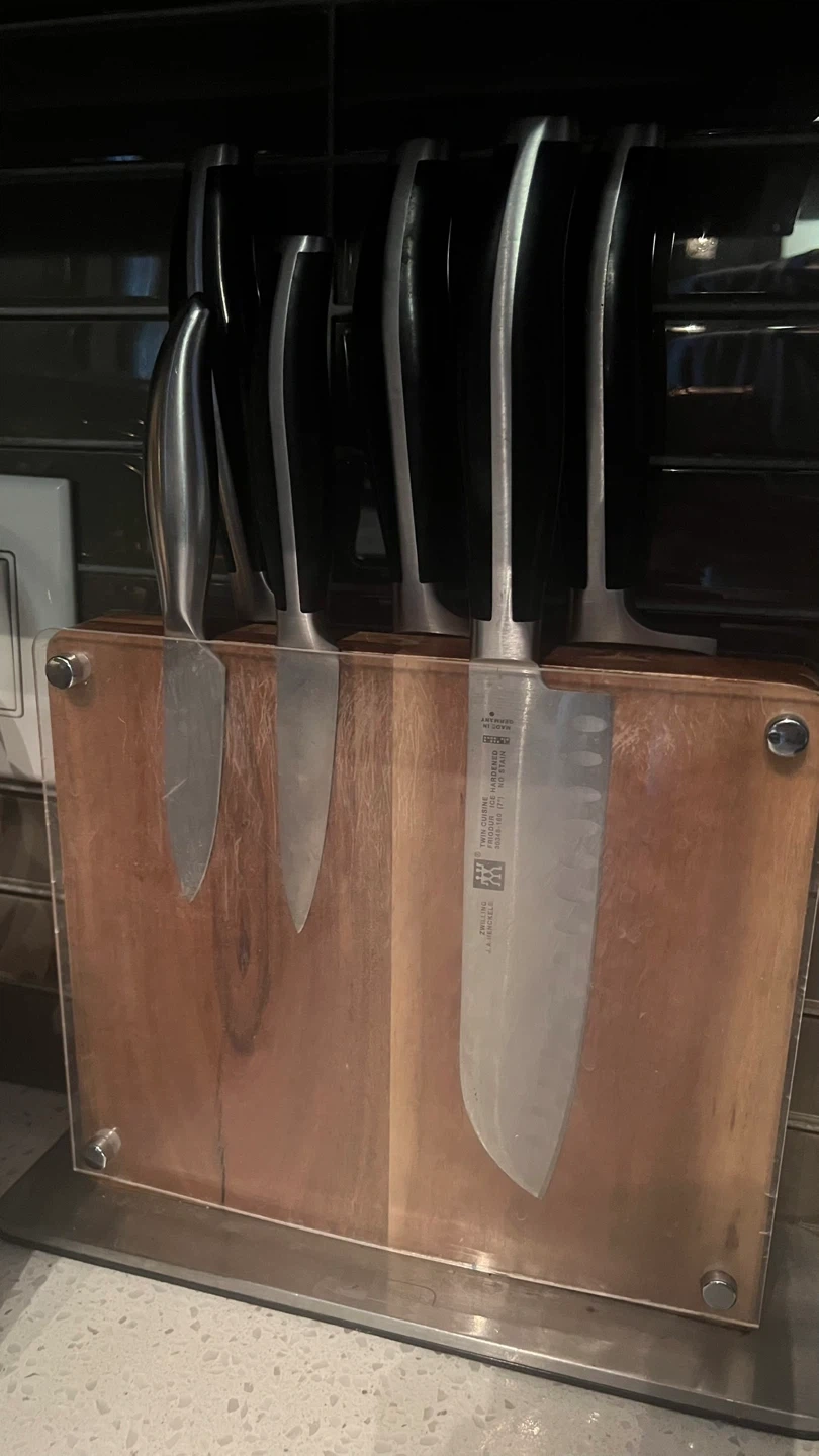 This knife block features a blend of wood and clear acrylic for a modern look. It securely holds multiple kitchen knives. The sturdy metal base keeps it stable on your countertop. (knifes not included)