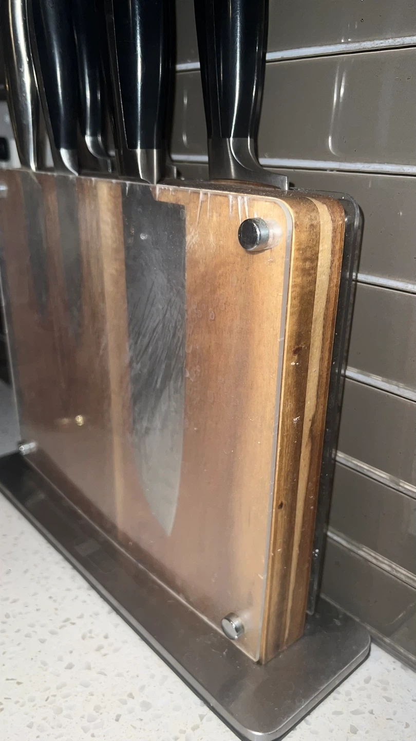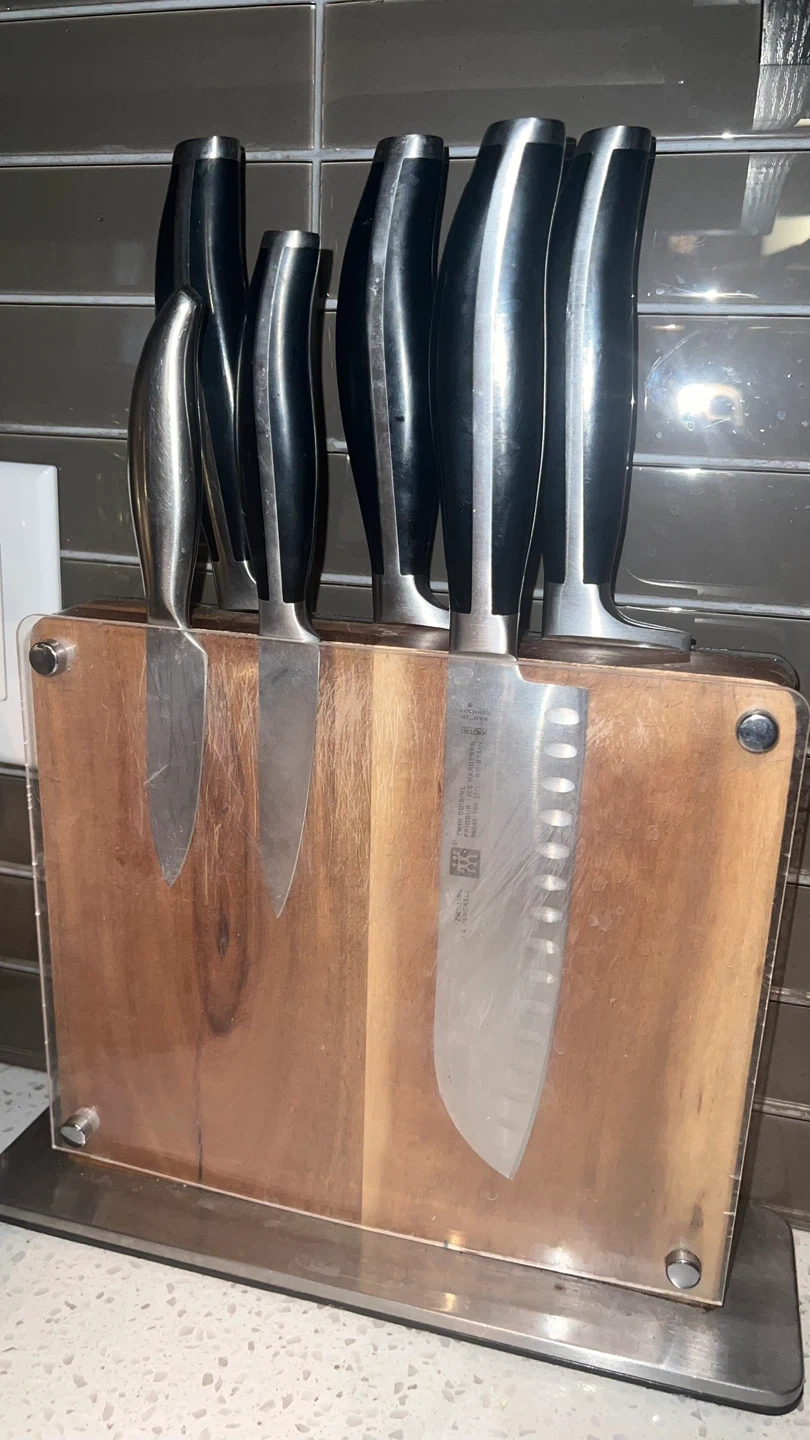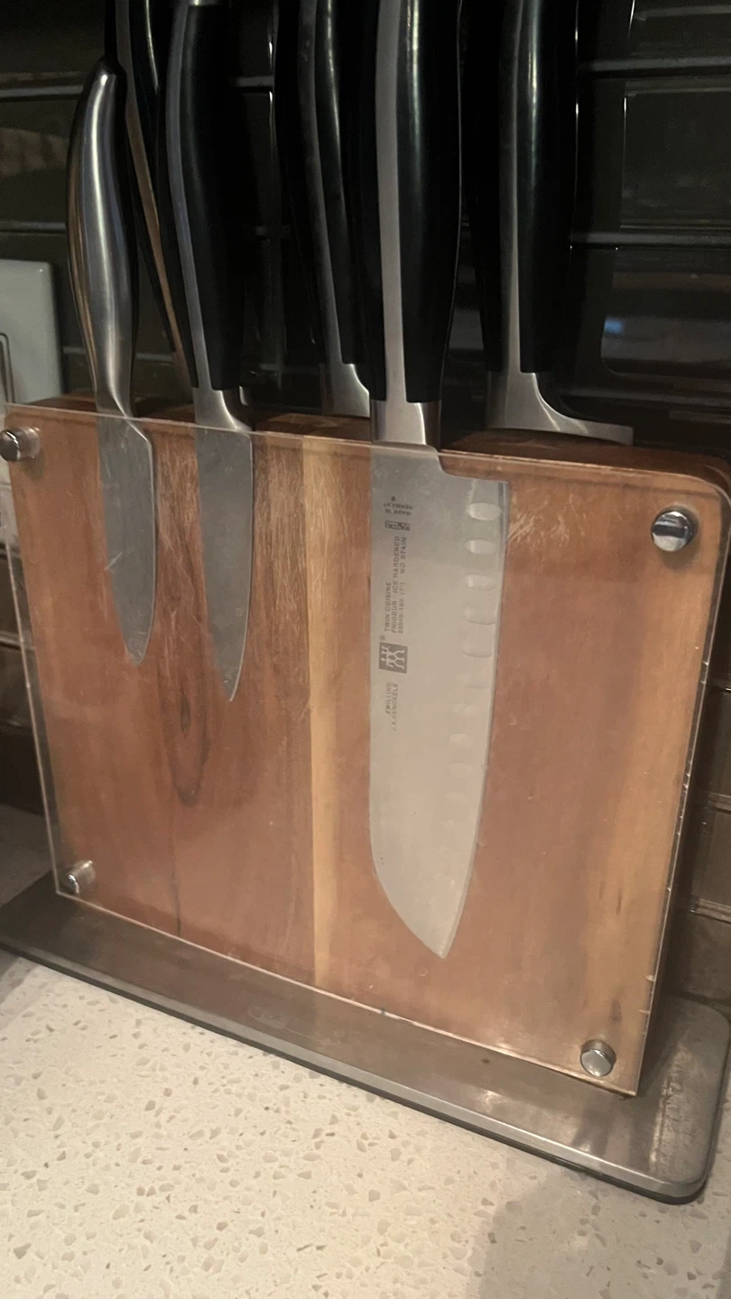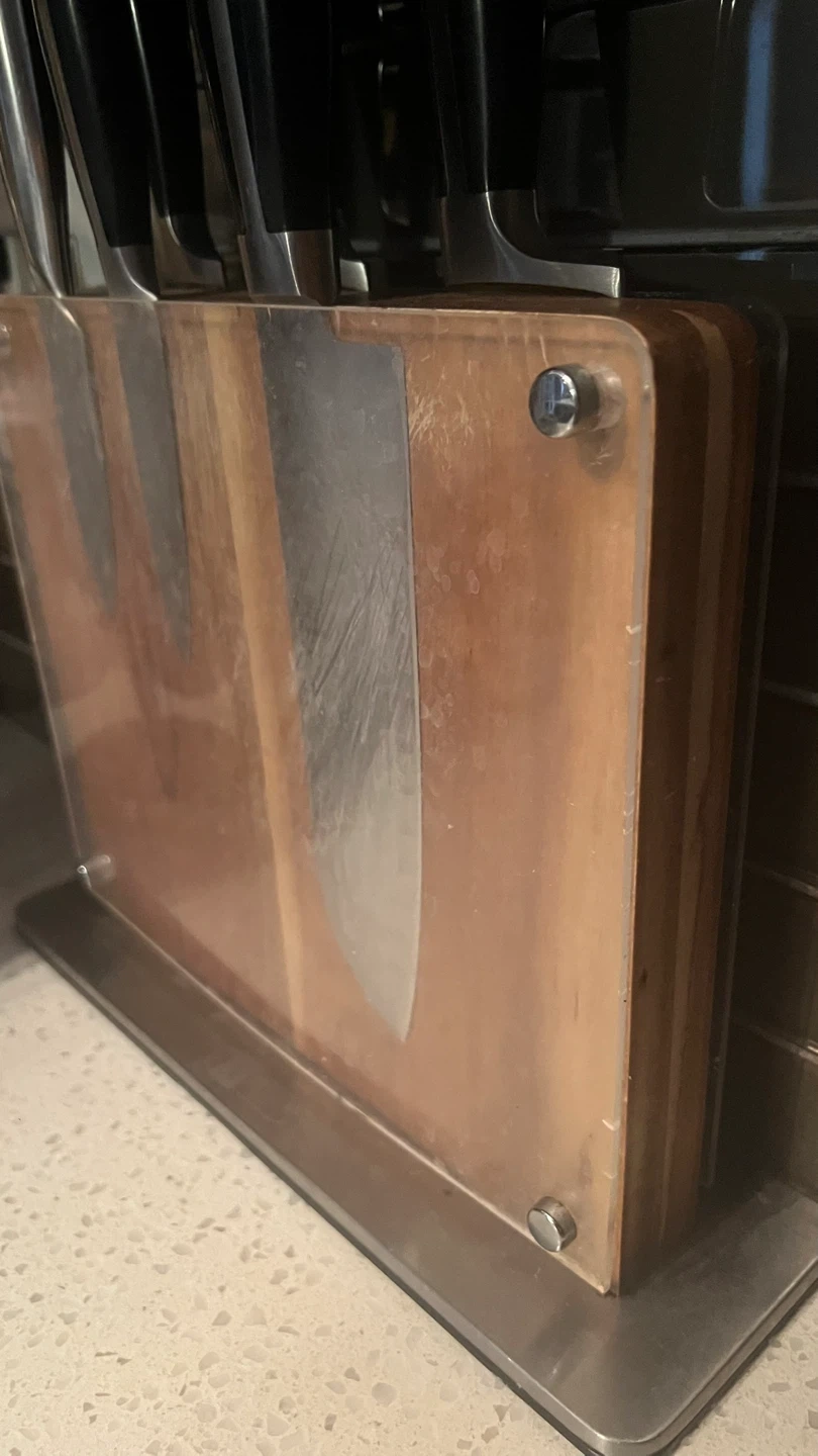 This knife block features a blend of wood and clear acrylic for a modern look. It securely holds multiple kitchen knives. The sturdy metal base keeps it stable on your countertop. (knifes not included)