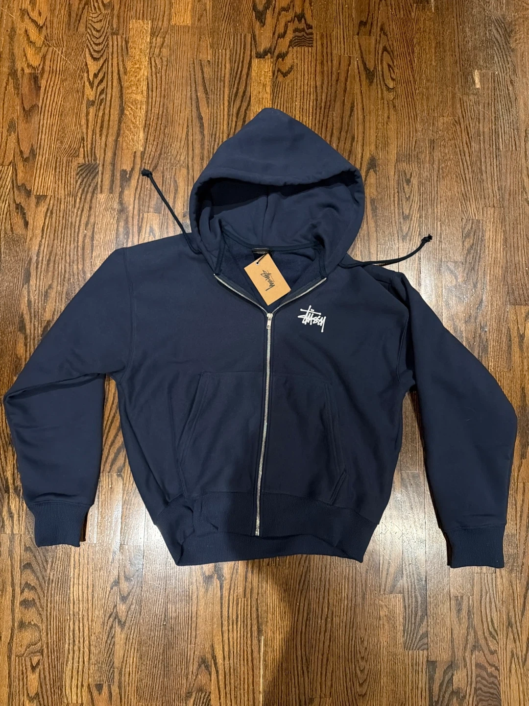 Selling a Stussy zip-up hoodie in navy blue! It features the classic Stussy logo on the front and back. Perfect for layering or wearing on its own. It's brand new never worn, includes original tag. Original price: $160.