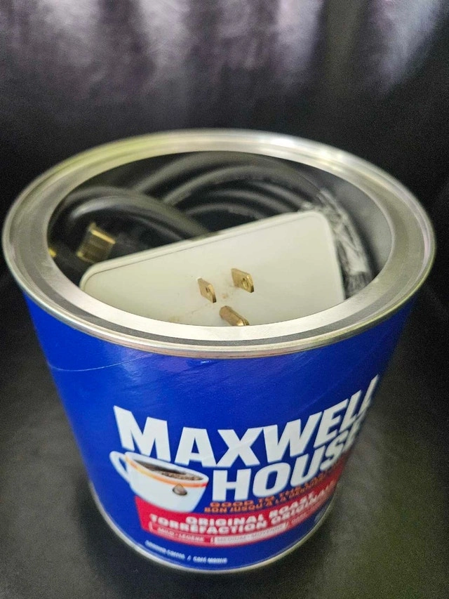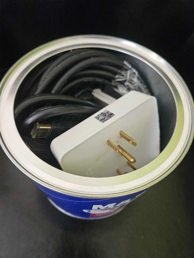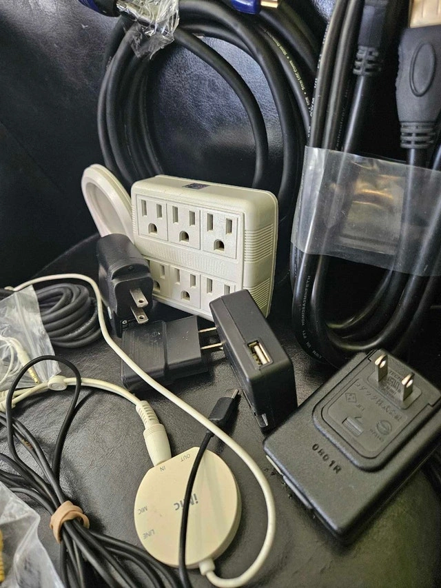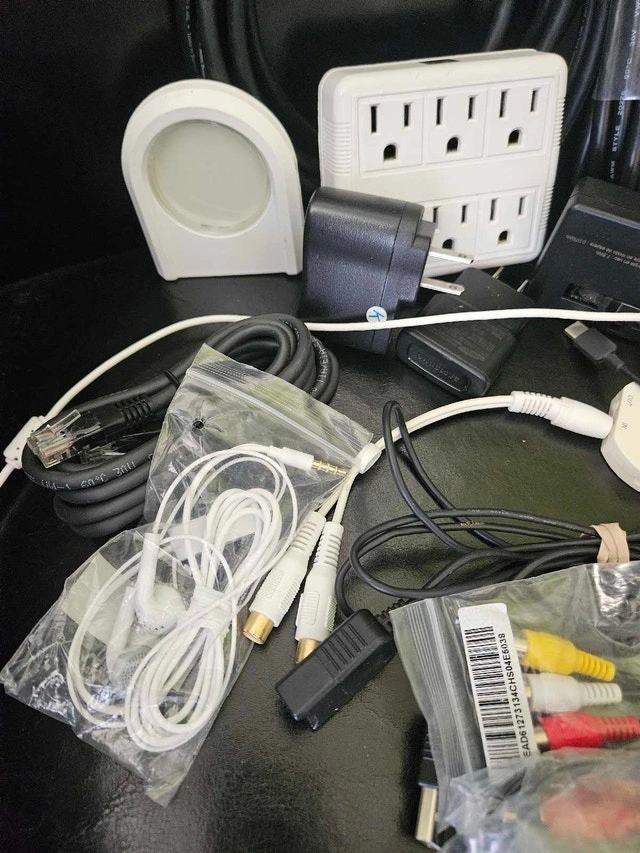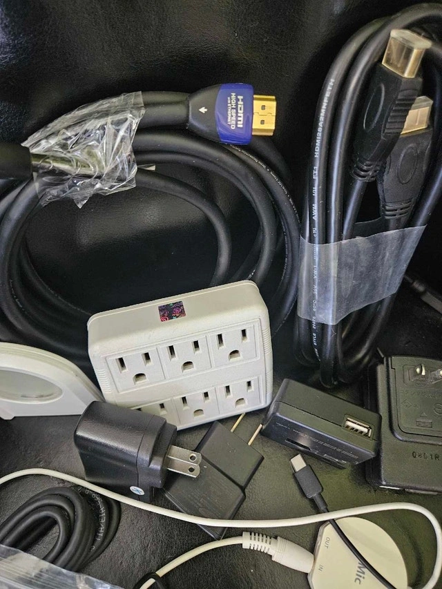 Power: 6-outlet wall tap + 4 USB charging blocks. Video: 2 High-Speed HDMI cables + RCA sets. Data/Audio: Ethernet cable, USB-C, and a line-out converter, Wired earbuds and a puck light. I'm probably forgetting to list a few things seen in the pics. Comes in the Maxwell House tin. Pick up in Eagle Place.