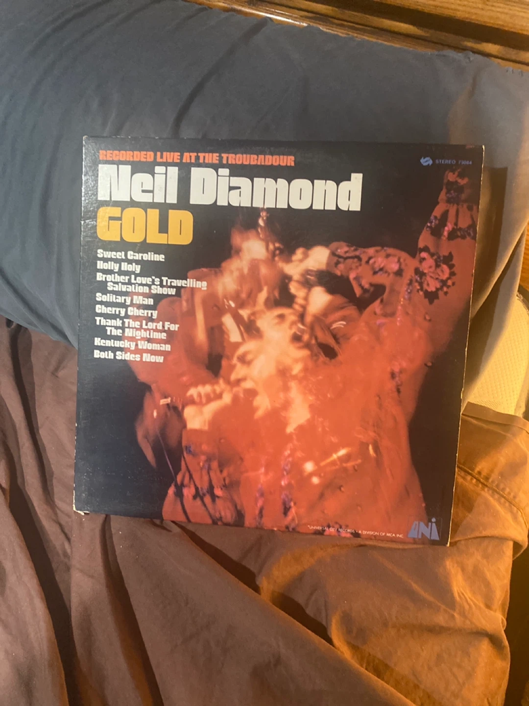 Selling a Neil Diamond Gold vinyl record, recorded live at the Troubadour. Features classics like Sweet Caroline, Holly Holy, and Brother Love's Travelling Salvation Show, plus many more!