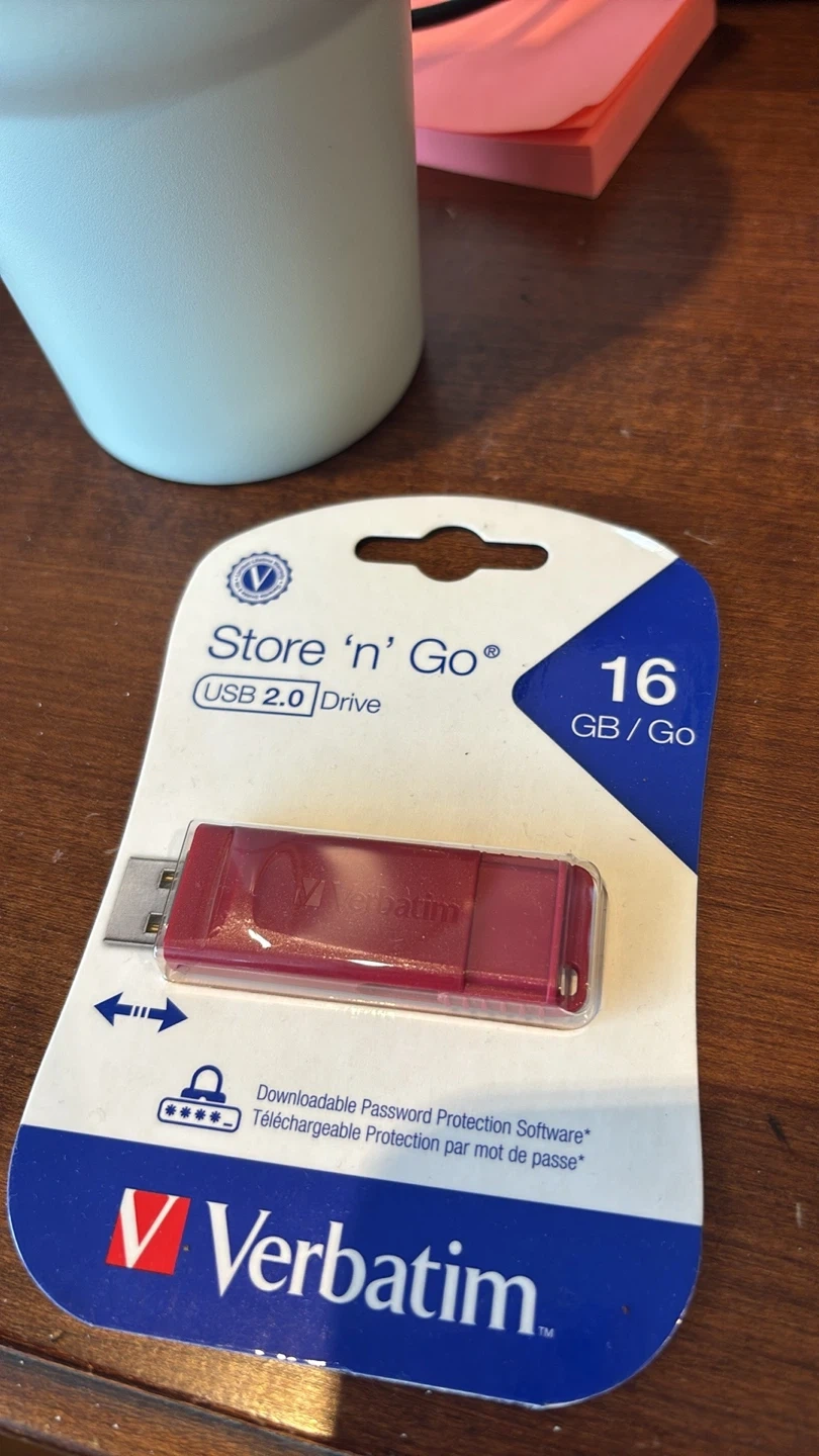 Verbatim Store 'n' Go 16GB USB 2.0 Drive. It's red and comes in the original packaging. Downloadable password protection software is available.