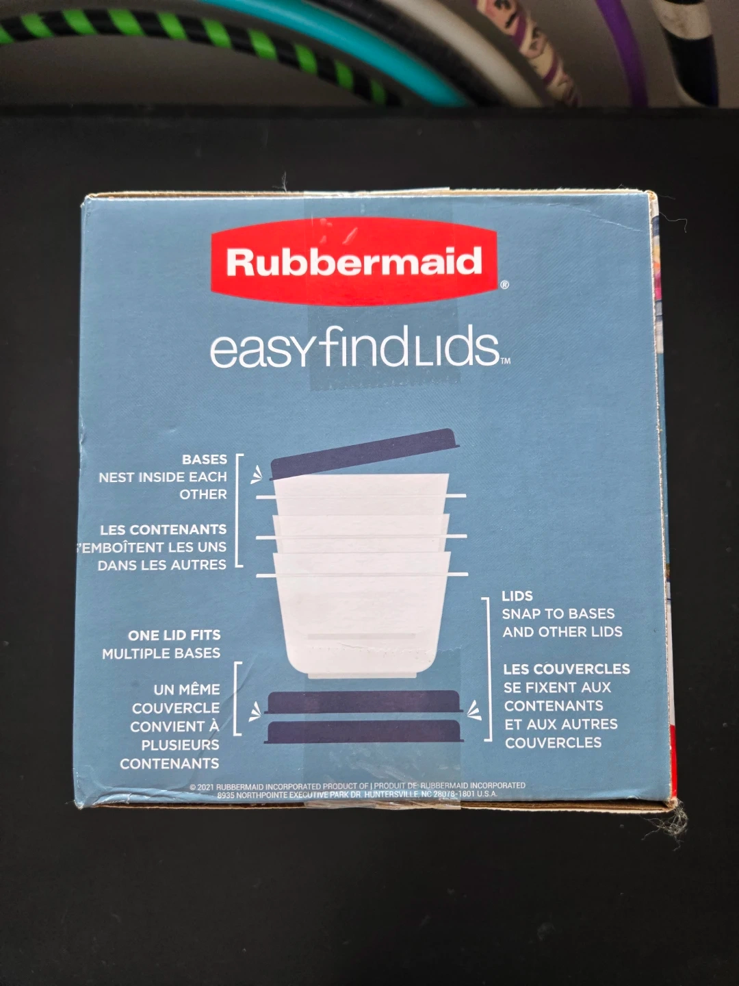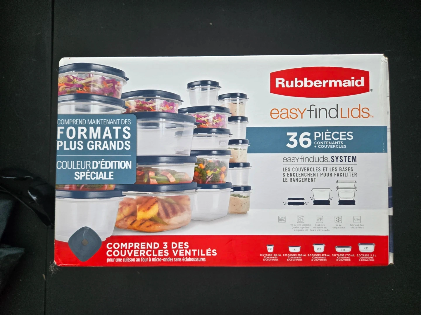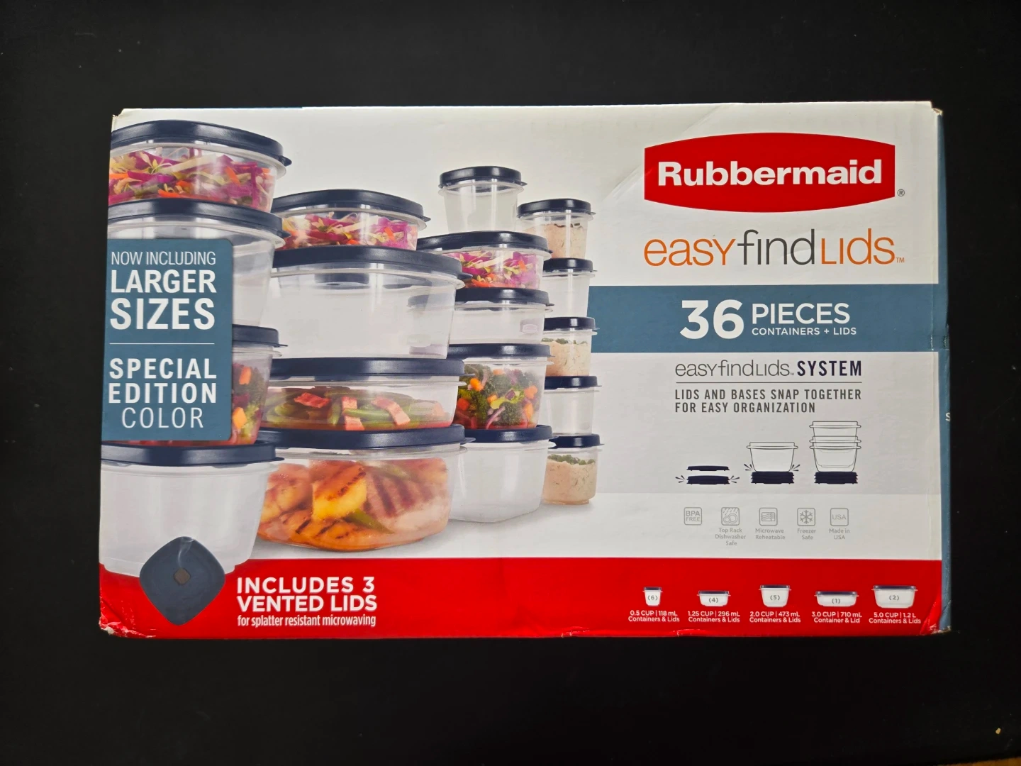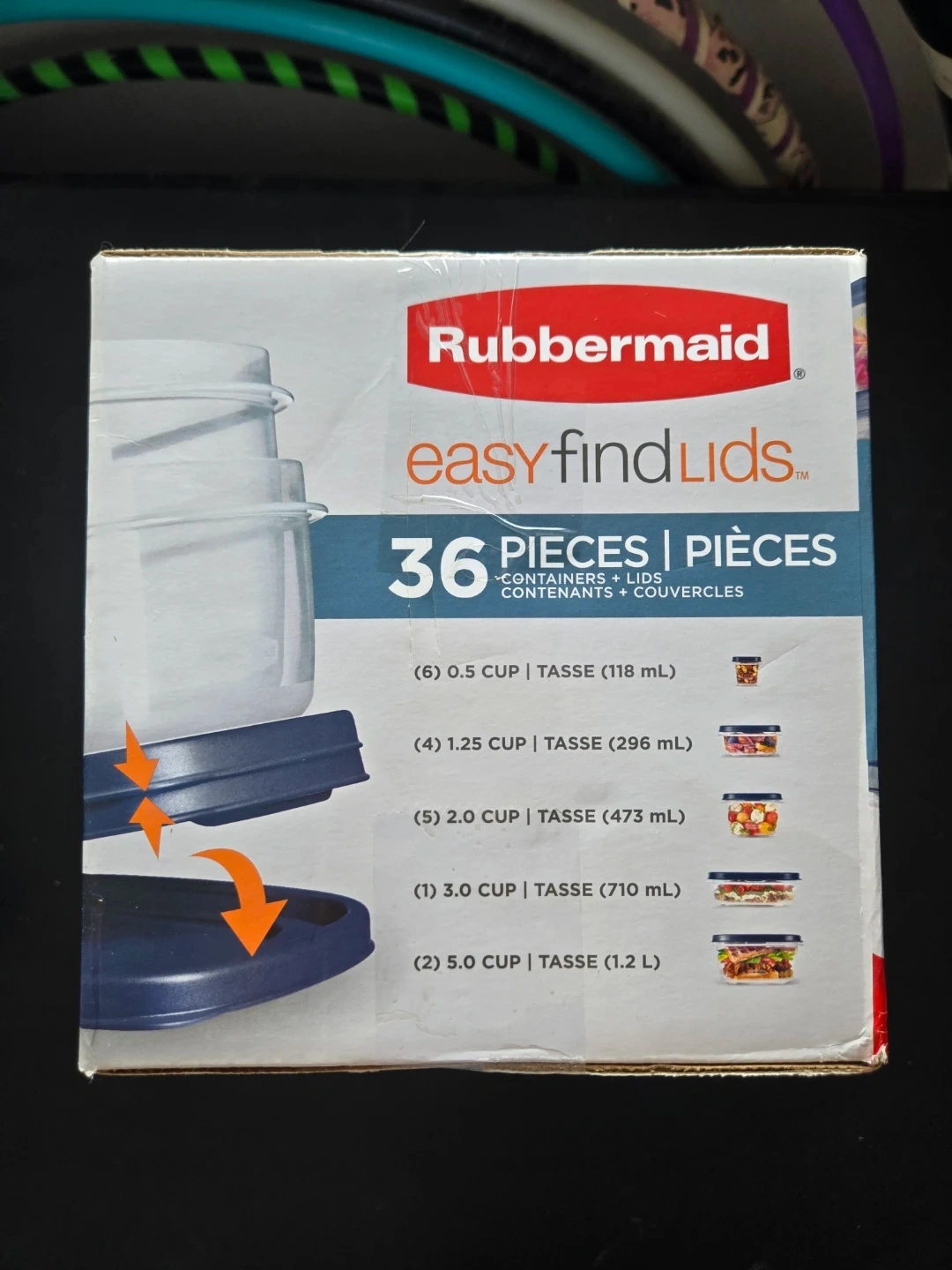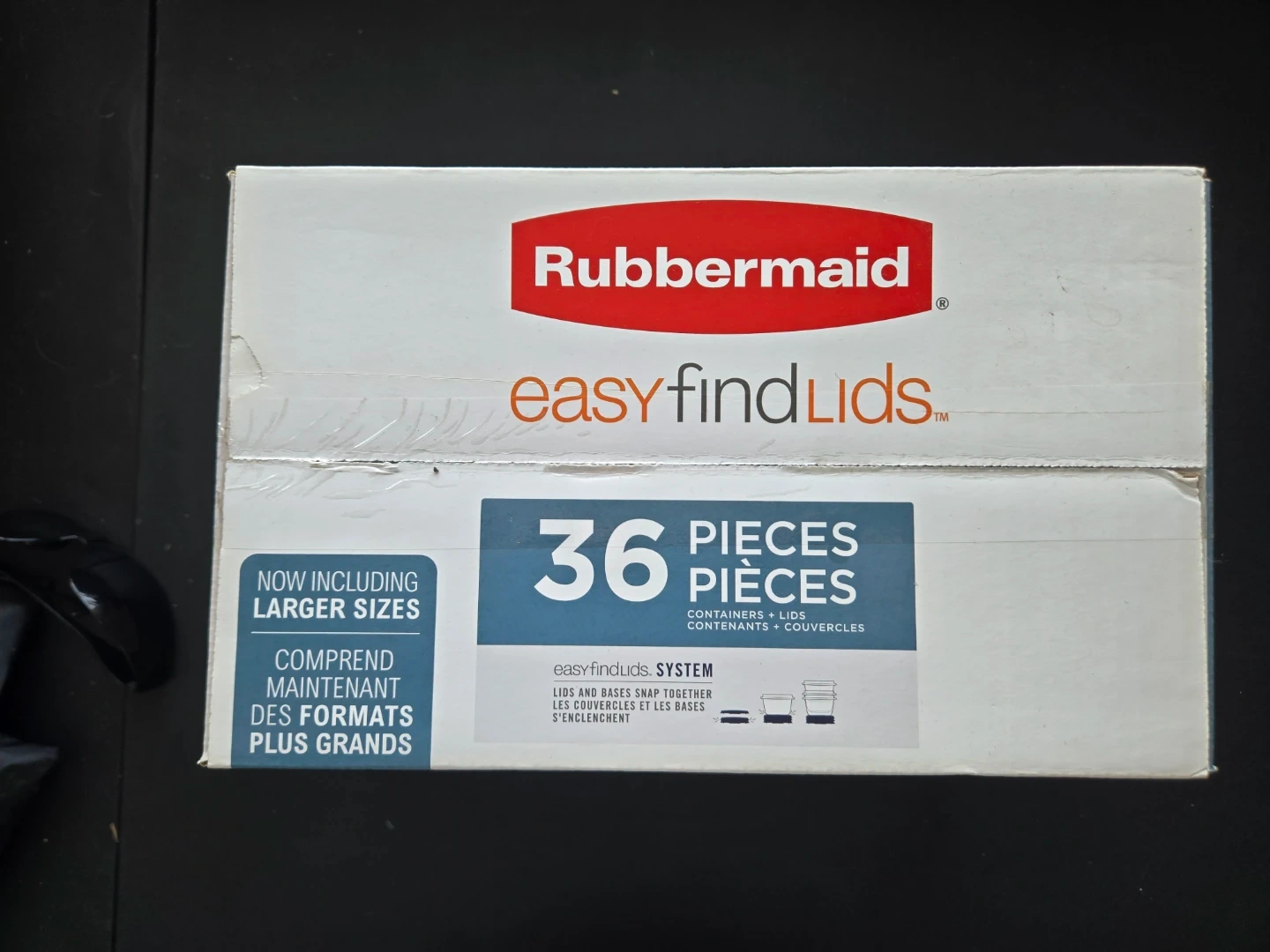 Selling a brand new, never opened Rubbermaid Easy Find Lids set. It includes 36 pieces of containers and lids. The lids and bases snap together for easy organization. The set also includes larger sizes. The containers are BPA free, microwave safe, and freezer safe.