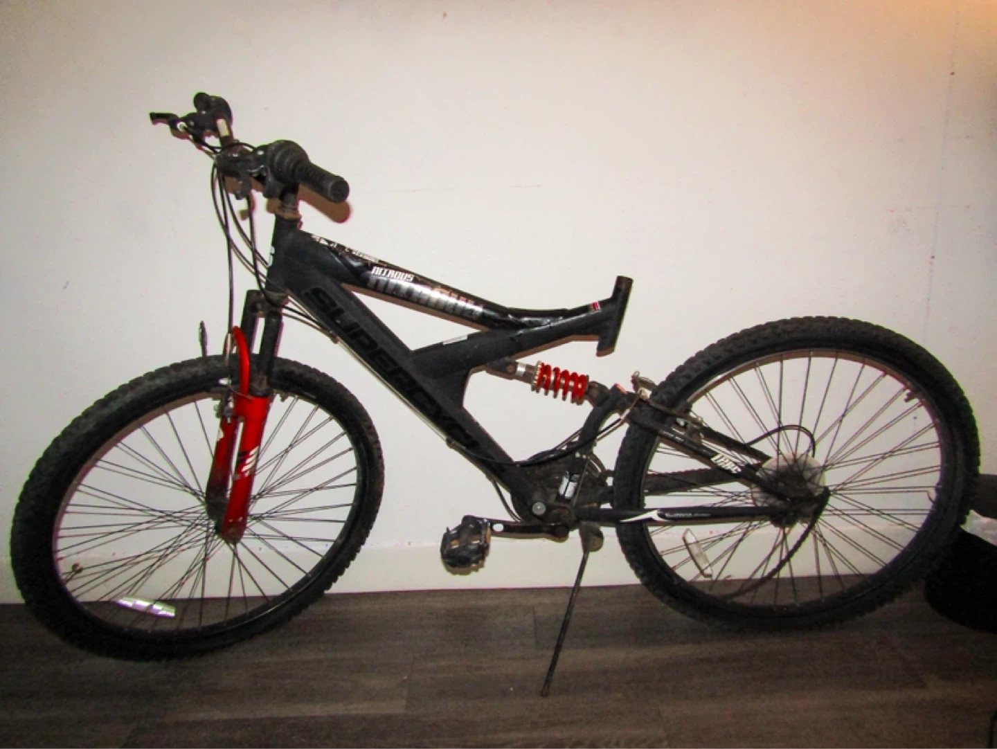 This is a black Supercycle mountain bike. It has front suspension and a rear shock absorber for a smoother ride. It's a full-suspension bike that's ready for trails! Just needs a seat for the bike.