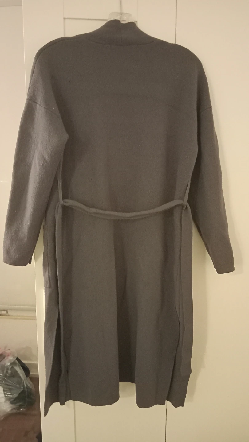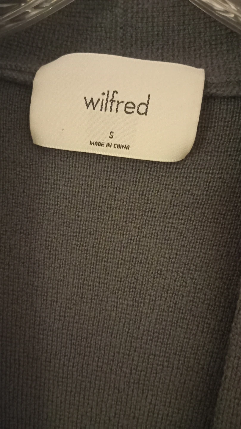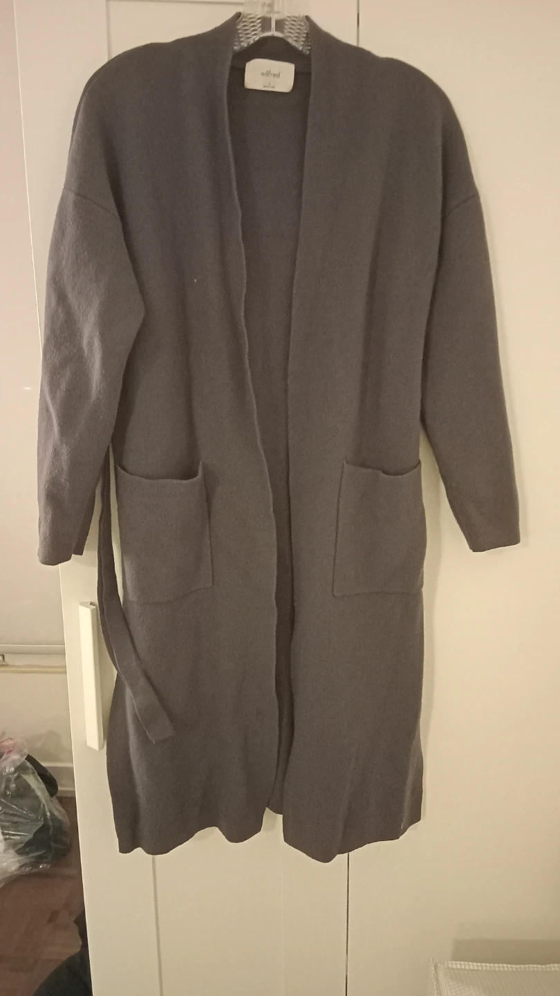 This is a Wilfred grey knit cardigan. It's a size small and made of a soft knit material. Features two front pockets and a tie belt. Great for layering over outfits!