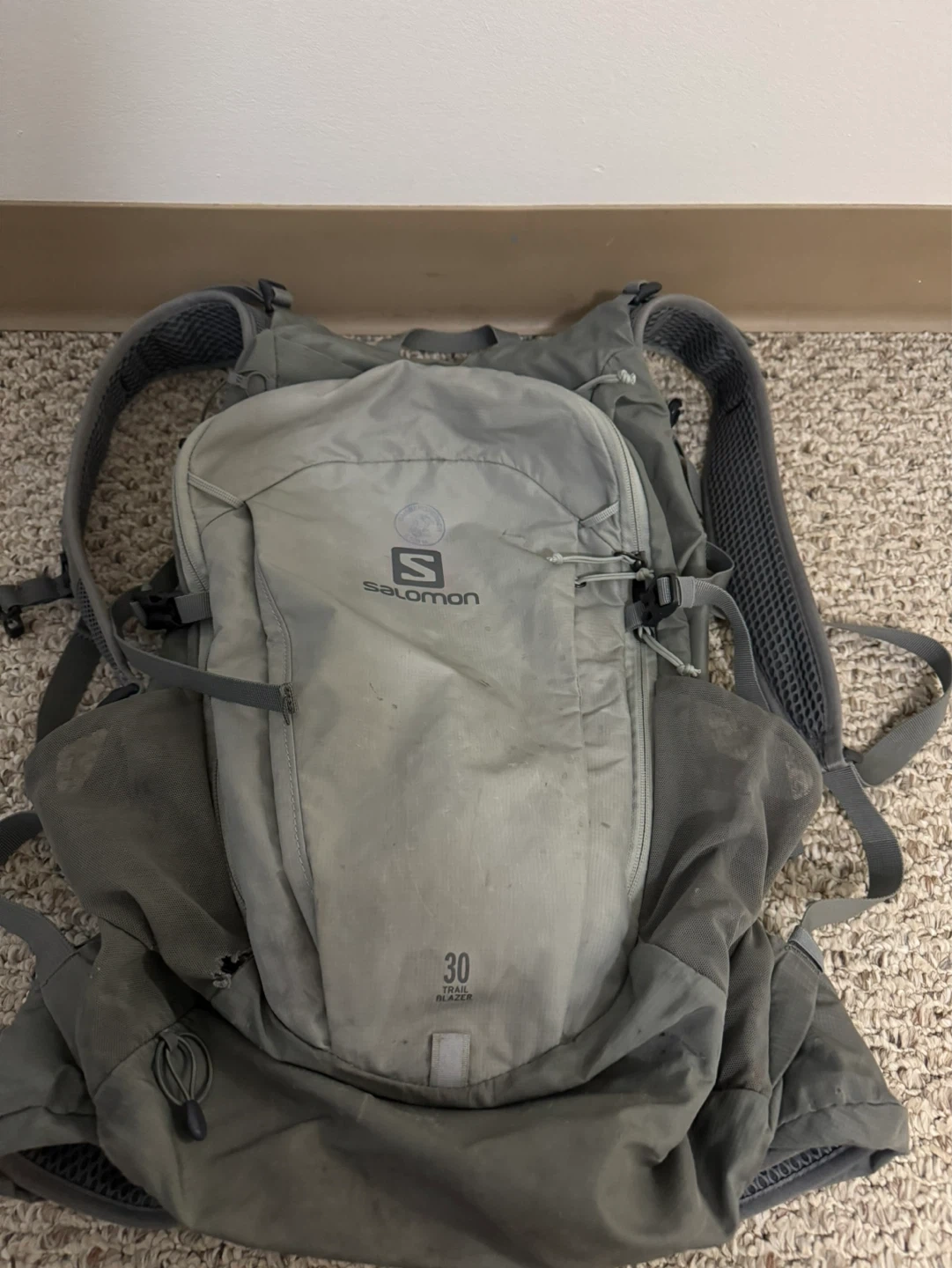 This is a gray Salomon 30 Trail Blazer backpack. It has adjustable straps and multiple pockets. It's suitable for hiking or trail running!