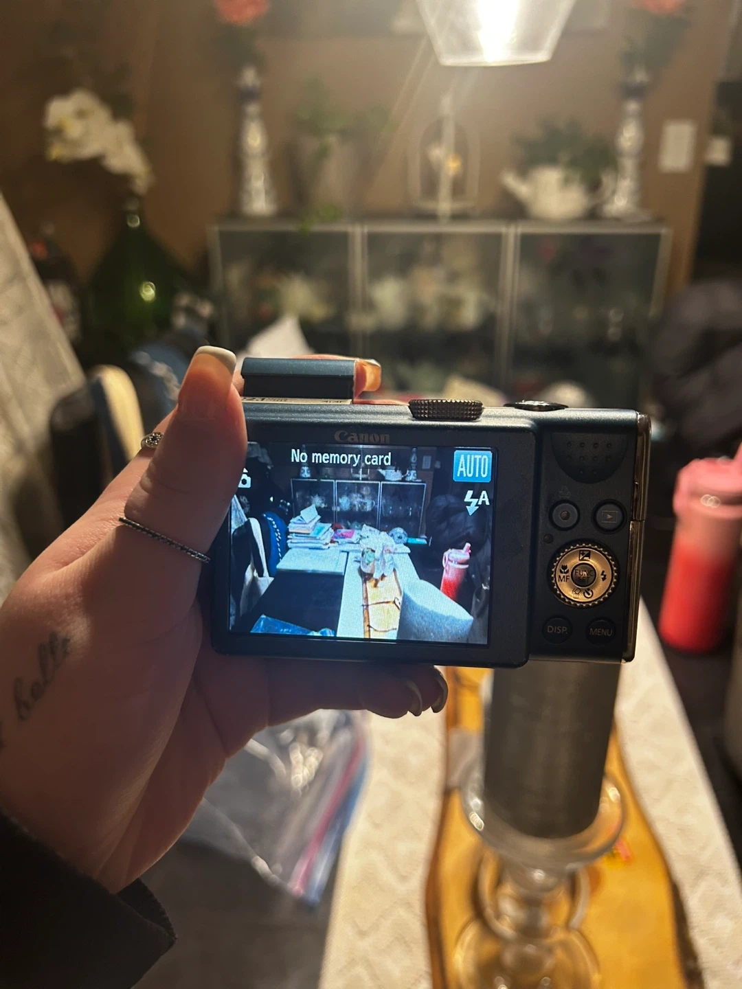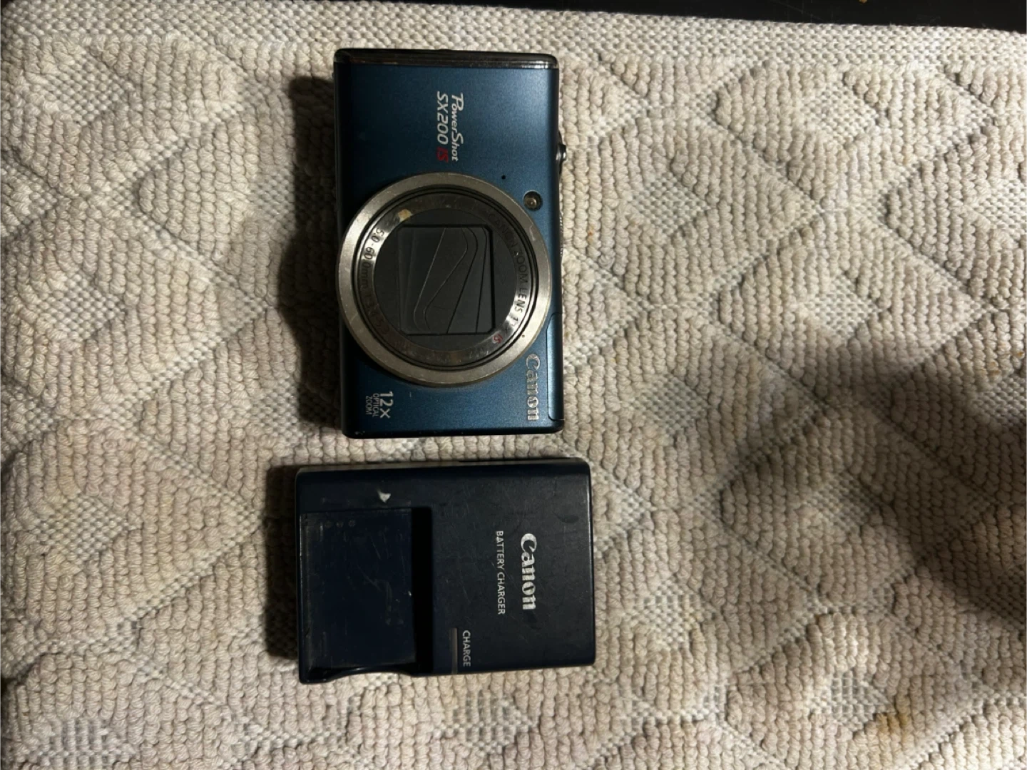 This blue Canon PowerShot camera has 12.1 megapixels and 12x optical zoom. It comes with a battery charger. It's a nice compact camera for everyday shots!