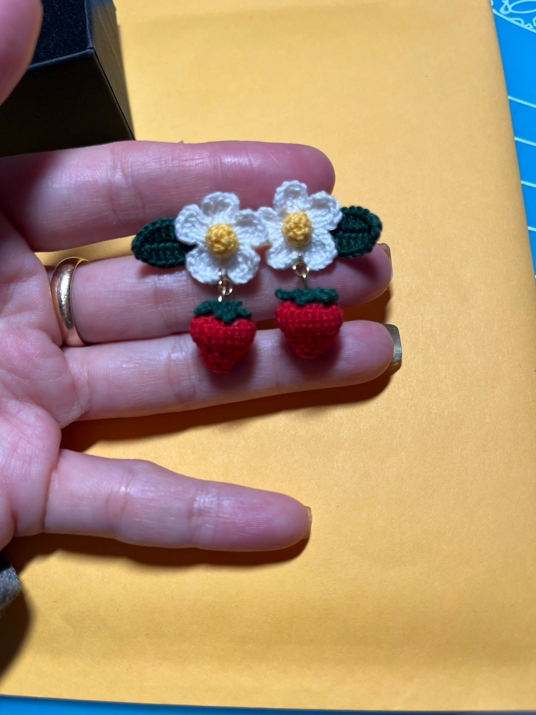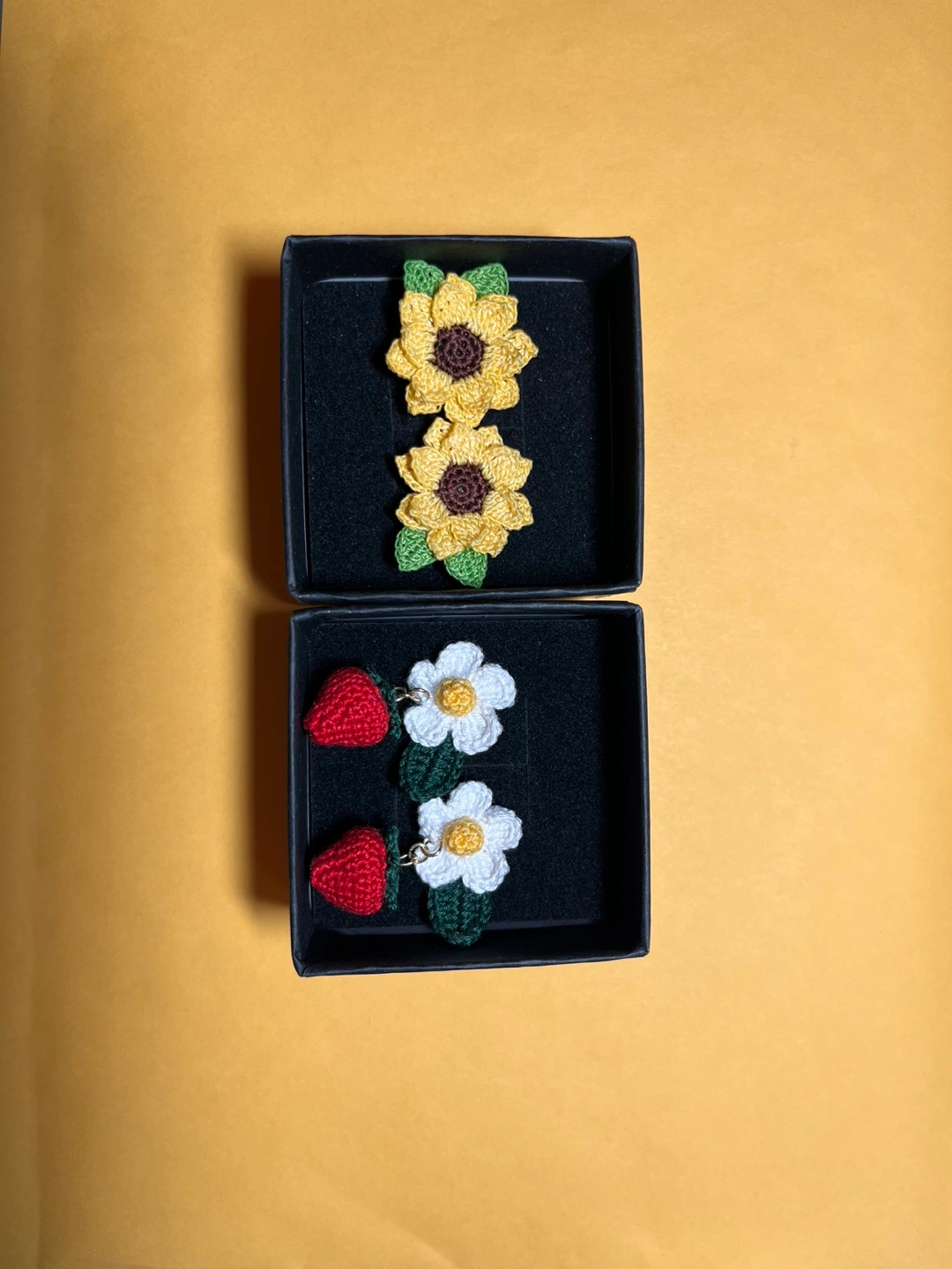 Adorable handmade crochet earrings, sunflowers and strawberries. Perfect for adding a touch of whimsy to any outfit. Lightweight and comfortable to wear. Comes in a gift box.