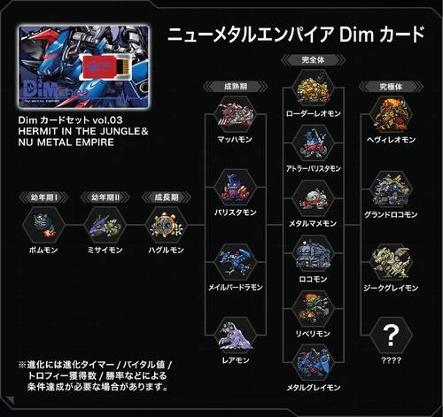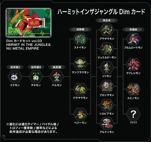 Dive into the evolution of Digimon with this exclusive Dim Card set, featuring the enchanting "Hermit in the Jungle" and the futuristic "Nu Metal Empire"! Elevate your V and BE Vital Bracelet experience with two captivating journeys that seamlessly blend nature and machinery. Set Contents: Hermit in the Jungle Dim Card x1 - Embark on an evolutionary adventure through lush greenery, where plant Digimon thrive in their natural habitat. The card is focused on Palmon and its digivolution tree. Nu Metal Empire Dim Card x1 - Immerse yourself in the mechanical wonders of the Nu Metal Empire. This card unveils evolution routes featuring lurking mechanical Digimon. The card is focused on Hagurumon and its digivolution tree. Enhance Your Digimon Experience: Combine the power of both Dim Cards for a comprehensive Digimon journey, uncovering the secrets of the jungle and the technological wonders of the Digital Monster world.