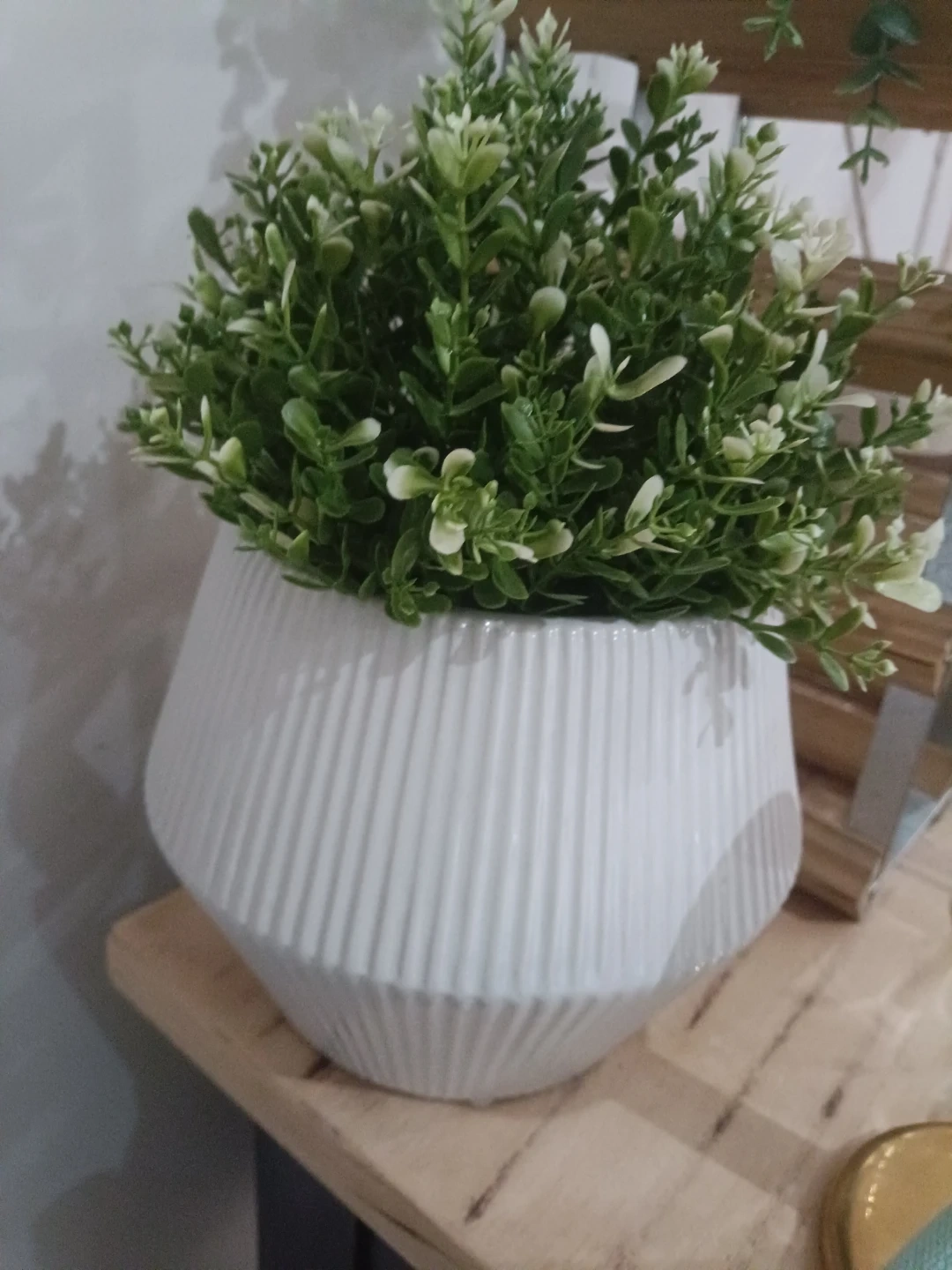 This white ceramic planter has a ribbed texture and contains faux greenery. It's a lovely decorative piece for any room. The planter is white and made of ceramic.