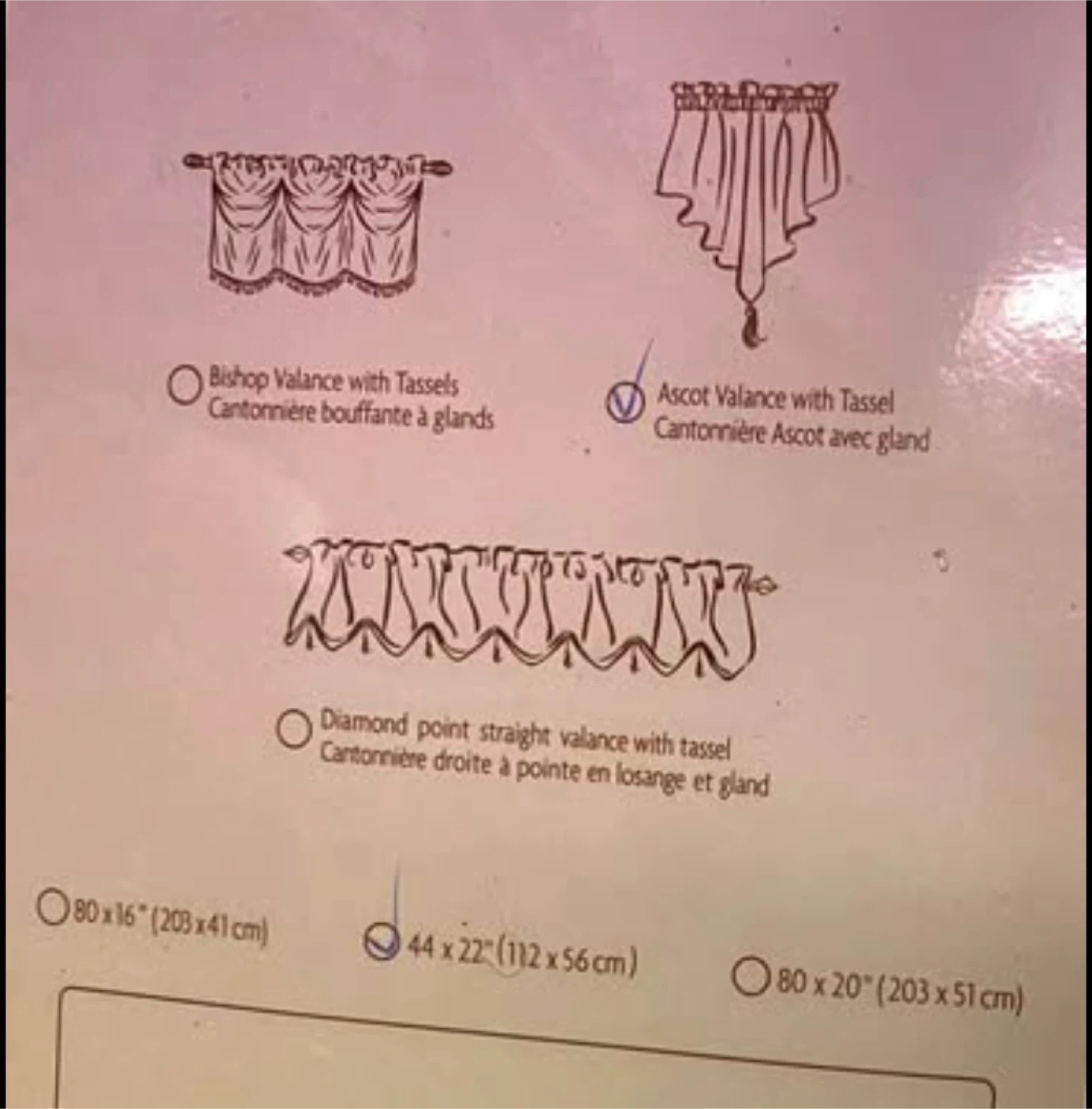 Whole Home Marlowe Ascot Valance with Tassel. It measures 44 x 22 inches (112 x 56 cm). Perfect for adding a touch of elegance to your home!