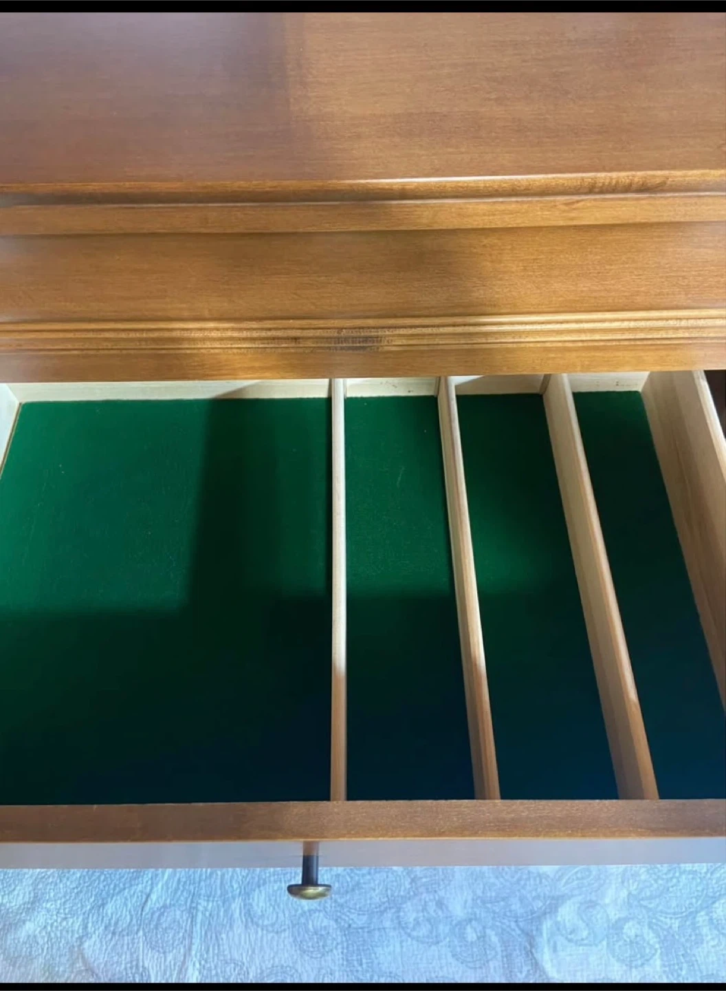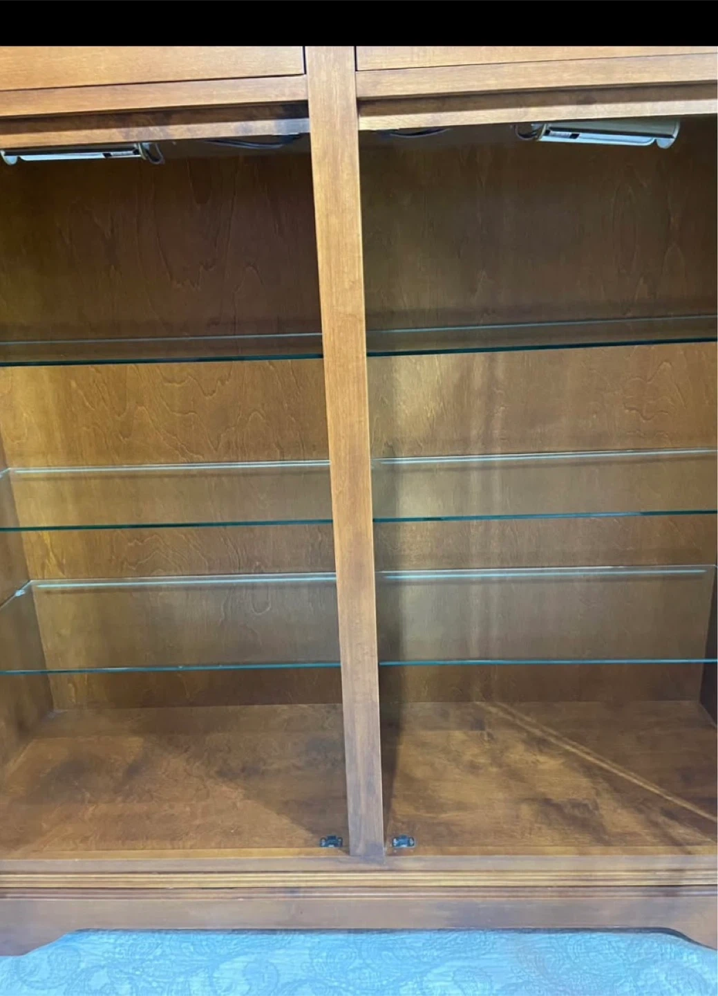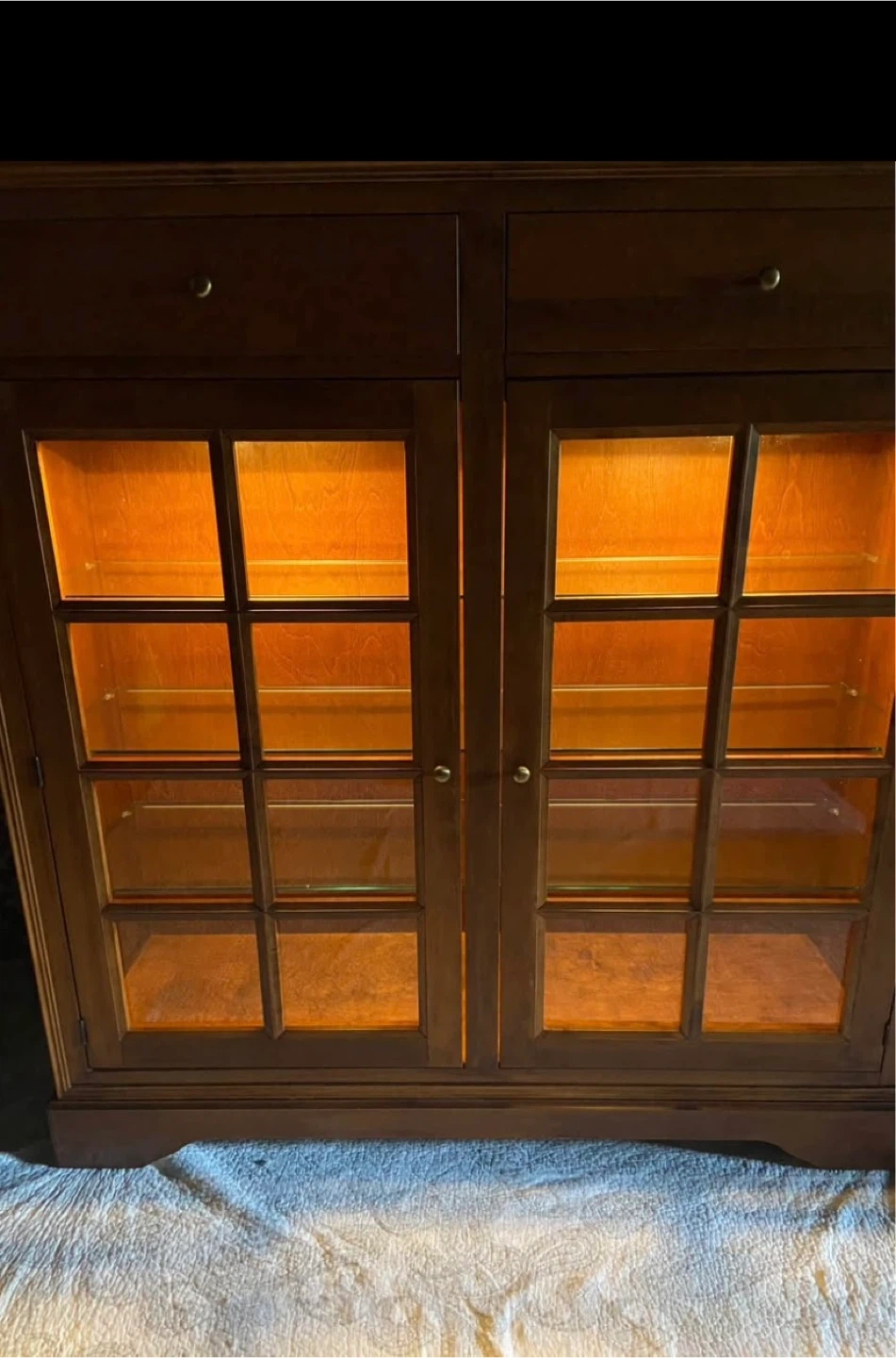 Here's a lovely wooden display cabinet, perfect for showcasing your favourite items! It features glass doors and drawers, and it's in great shape. It would be a great addition to any living room or dining room