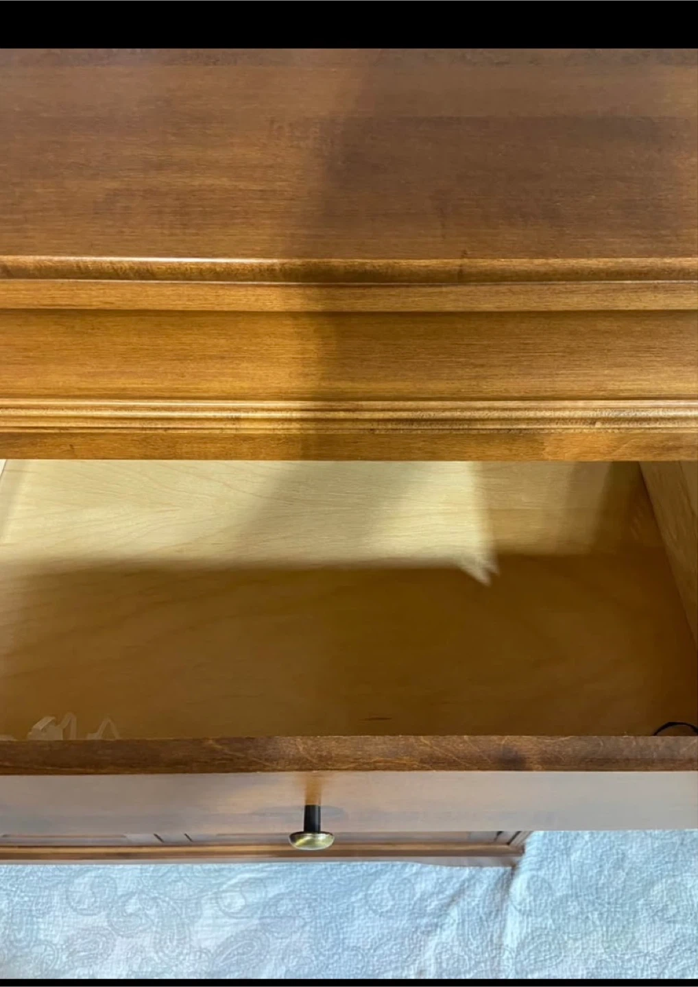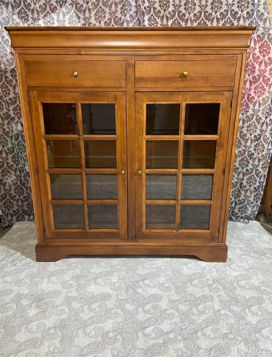 Here's a lovely wooden display cabinet, perfect for showcasing your favourite items! It features glass doors and drawers, and it's in great shape. It would be a great addition to any living room or dining room