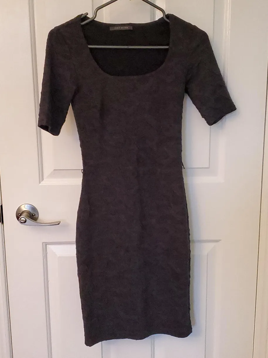 Selling a dark grey xs bodycon textured dress from Suzy Shier. It has a square neckline and short sleeves. Great for a night out or a special occasion!