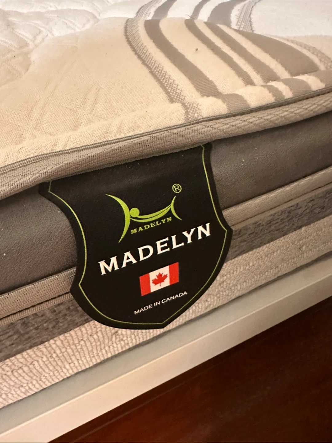 This Madelyn mattress (SLEEMON) offers comfort with its quilted top and grey and white patterned design. It's made in Canada. It's a good option for a bedroom.