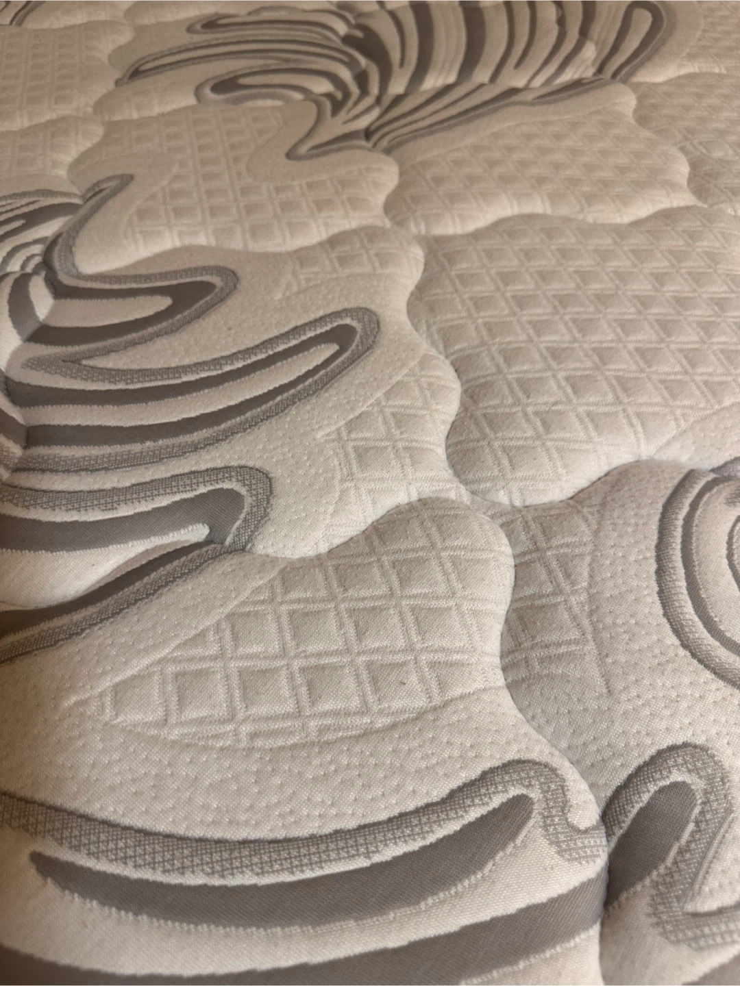 This Madelyn mattress (SLEEMON) offers comfort with its quilted top and grey and white patterned design. It's made in Canada. It's a good option for a bedroom.