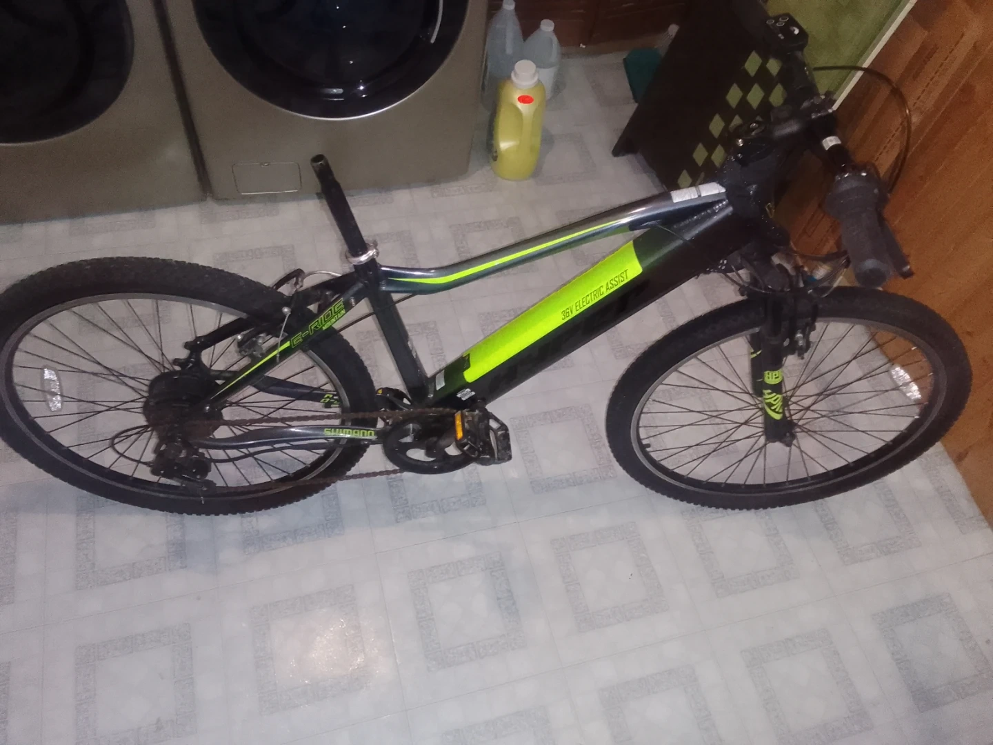 FREE Black mountain bike with bright green electric assist decals. Features Shimano components. Comes with power cord but I cannot get it to power up. Tires are flat. Brakes need fixing. Spokes need reattached. Chain is a little rusty. Good for parts.