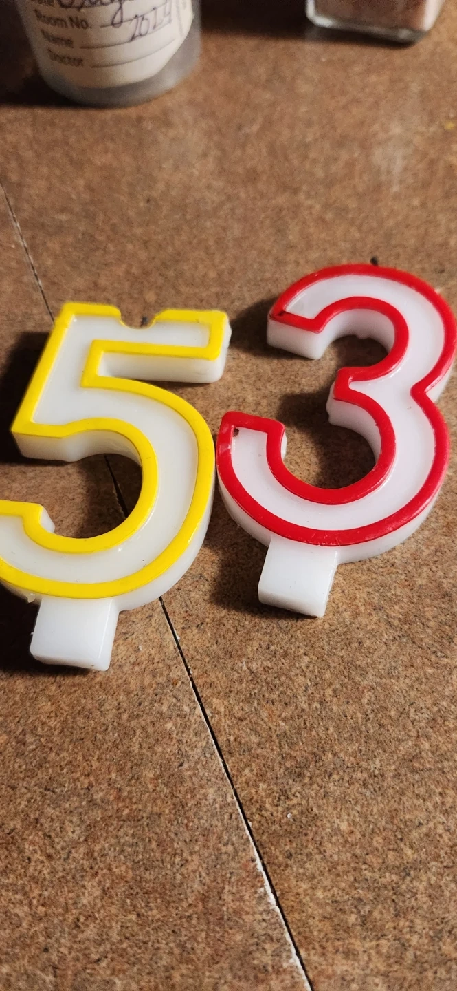 These are birthday candles in the shape of the numbers 5 and 3. The '5' candle has a yellow trim and the '3' candle has a red trim. They're perfect for celebrating a 53rd birthday. Each candle has a white base for sticking into cake.