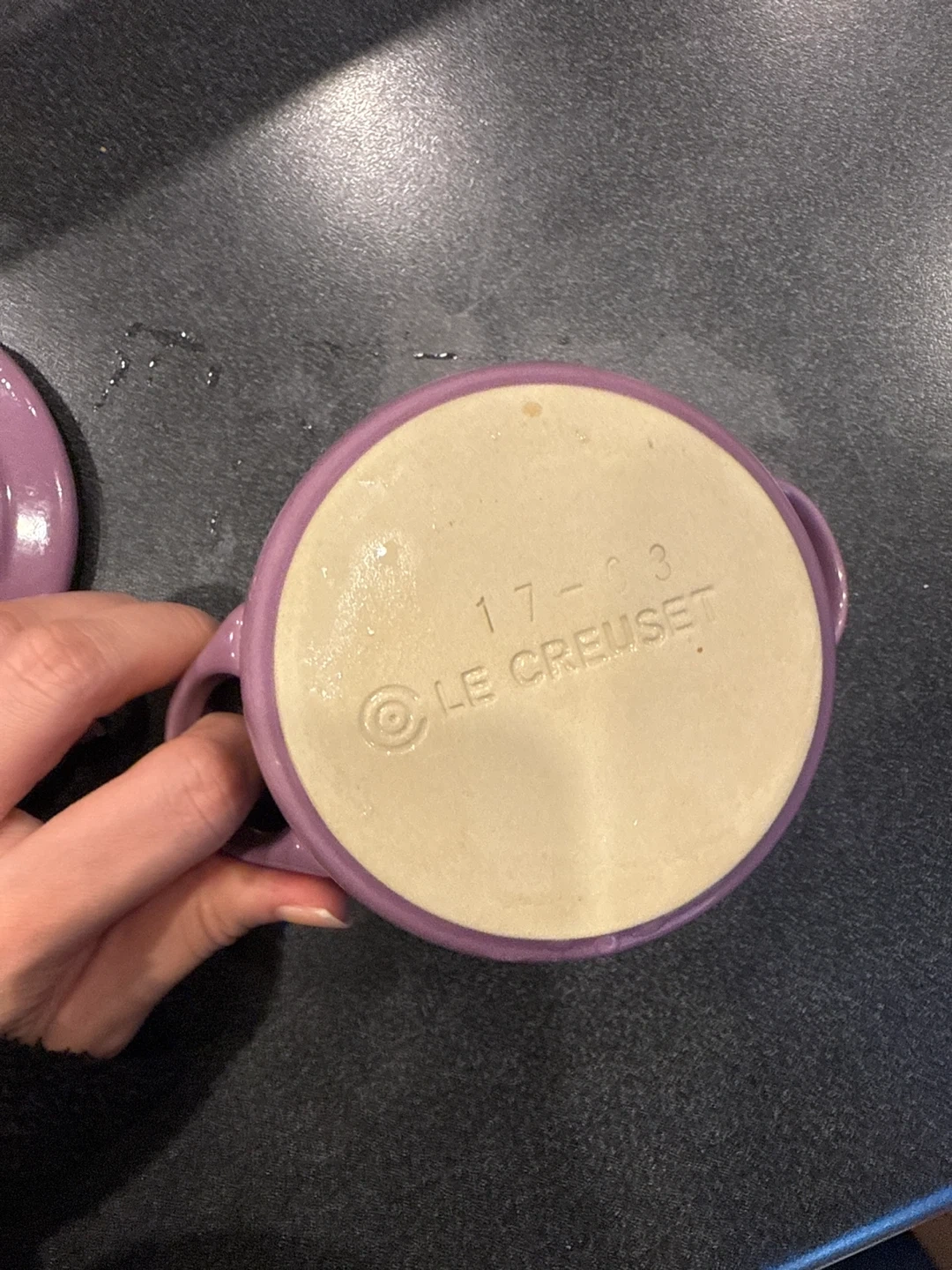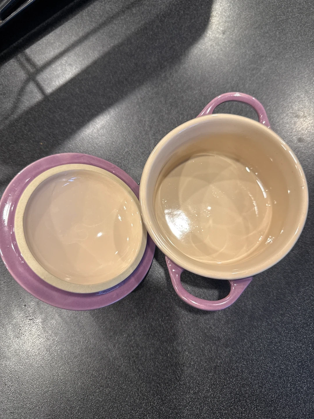 Selling a cute Le Creuset mini cocotte in a lovely lavender colour! It's in great condition and perfect for individual servings or dips. There is a small chip on the side. It's a charming addition to any kitchen