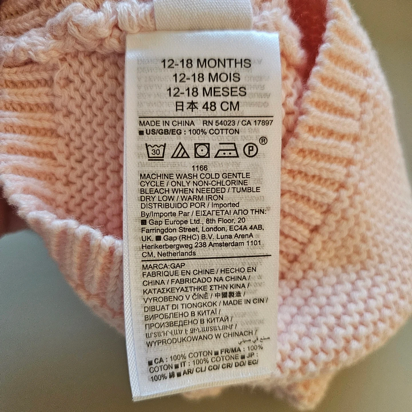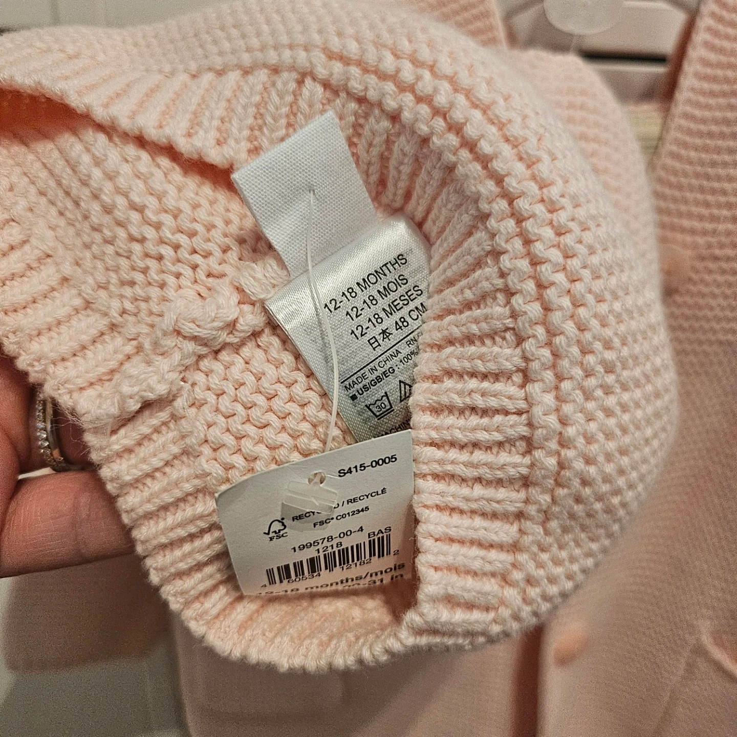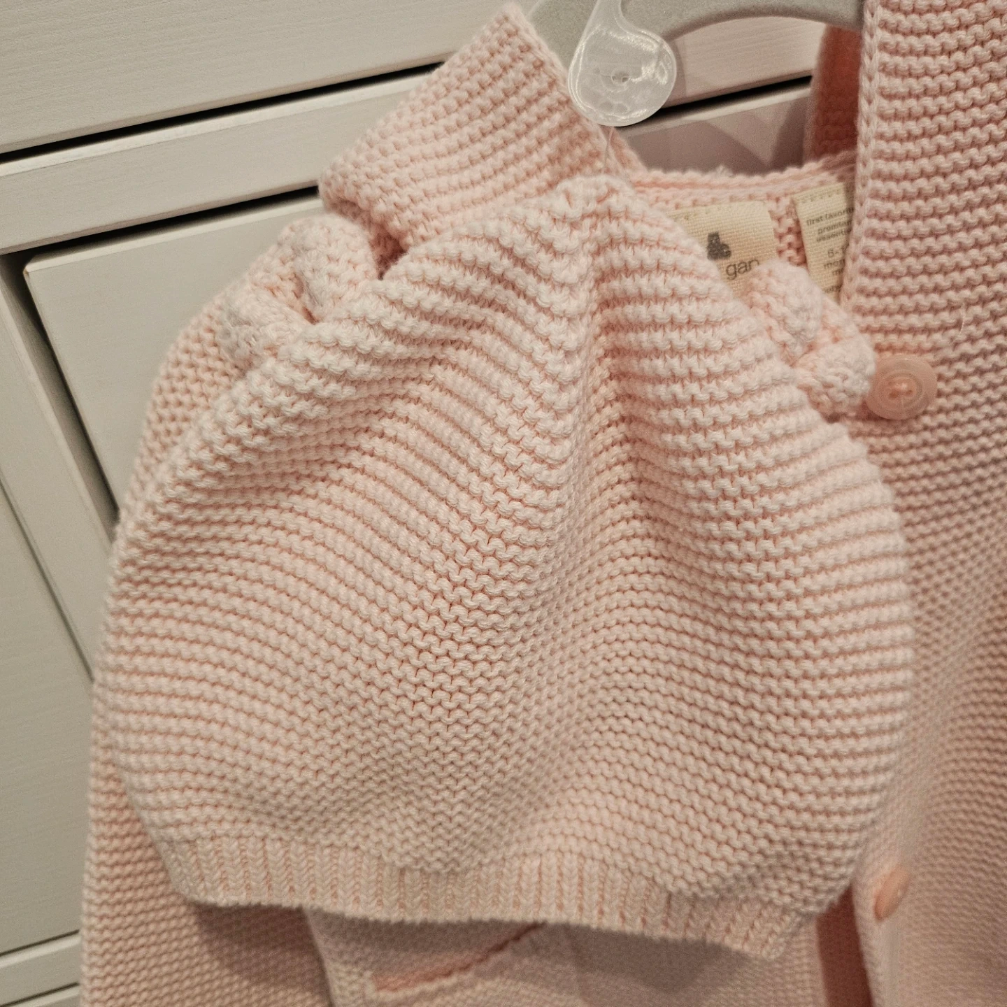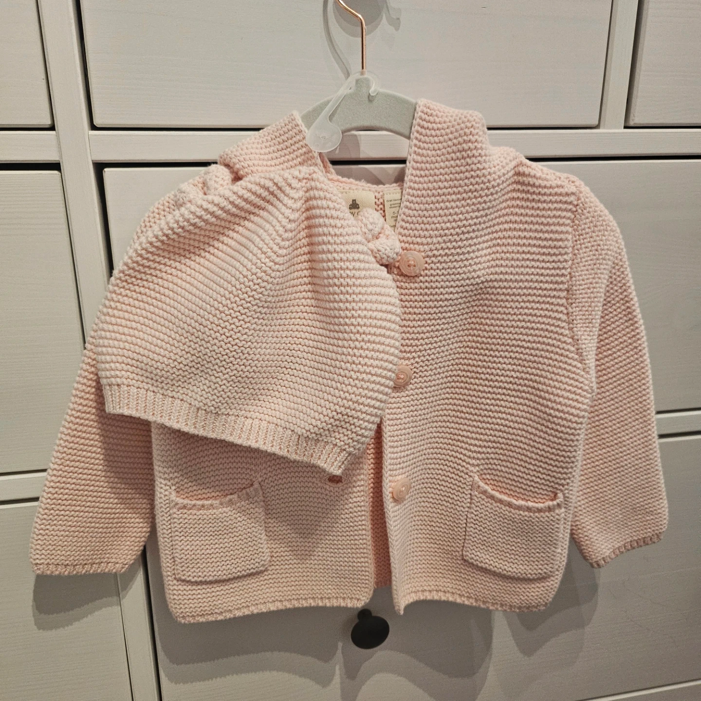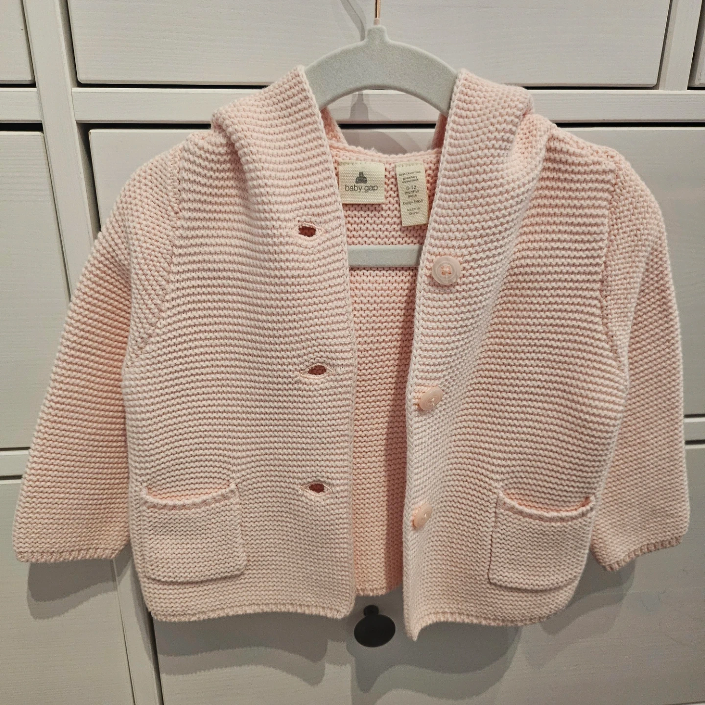 Sweet pink knit cardigan with a hood and matching hat from Baby Gap. Hat is a size 12-18 months, made with 100% cotton. Cardigan is 6-12 months size and features two front pockets and button closures. Both are in new condition.